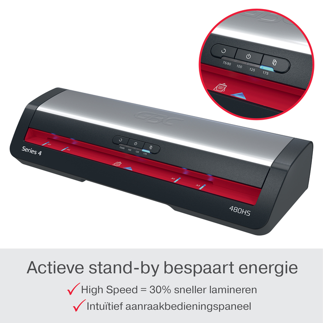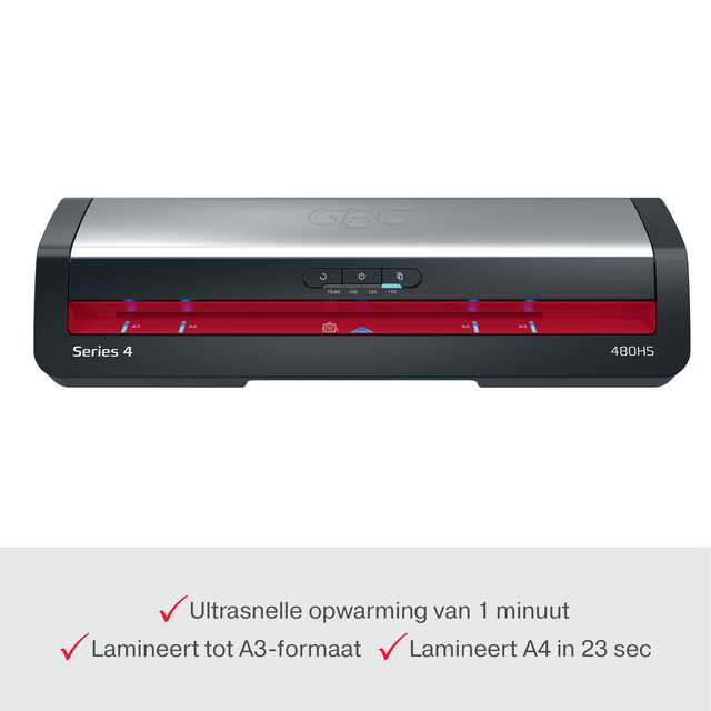 De GBC 480HS A3 lamineermachine biedt een betrouwbare en efficiënte oplossing voor het lamineren van grote volumes. Deze snelle lamineermachine is ontworpen voor professionele omgevingen en combineert prestaties met gebruiksgemak. Verhoog de productiviteit en verkort de lamineertijd met 33% met GBC HighSpeed lamineerhoezen. Met een snelle opwarmtijd van 1 minuut lamineert hij een A4 vel van 75 micron in slechts 23 seconden, waardoor hij ideaal is voor snelle kantoortaken. Het intuïtieve bedieningspaneel biedt vier instellingen voor lamineerhoesdikte van 75 tot 175 micron, wat flexibiliteit biedt voor verschillende soorten documenten. Het paneel heeft ook een handmatige omkeerknop en een automatische omkeerfunctie met actieve vastzetsensor voor naadloze verwijdering van een vastgelopen lamineerhoes. Bovendien geeft het SMART status ledsysteem duidelijke visuele en auditieve signalen: rood tijdens het opwarmen, blauw met een geluid wanneer de machine klaar is en een automatische uitschakeling na 15 minuten inactiviteit om energie te besparen. De SMART invoerleds zorgen voor een rechte uitlijning van de lamineerhoes om vastlopen te voorkomen, waardoor elke laminering perfect is. Bescherm en bewaar je belangrijke documenten met snelheid en telkens weer een gladde, professionele afwerking. * Snelle opwarmtijd, klaar voor gebruik in slechts 1 minuut. * Compatibel met lamineerhoezen van 75 tot 125 micron. * Lamineert ID-kaarten tot A3 formaat documenten. * GBC HighSpeed lamineermachines verkorten de lamineertijd met 33% bij gebruik van GBC HighSpeed lamineerhoezen. * Lamineert een A4 document (75 mic) in slechts 23 seconden. Lamineert 26x A4 in 10 minuten. * SMART status led: brandt rood tijdens het opwarmen en wordt blauw met een geluidssignaal wanneer de lamineermachine klaar is voor gebruik. * SMART invoerleds: zorgen ervoor dat de lamineerhoezen recht door de lamineermachine worden gevoerd om vastlopen te voorkomen. * De automatische omkeerfunctie detecteert een probleem en keert de lamineerhoes automatisch uit de machine terug. * Het bedieningspaneel heeft een anti-vastloop omkeerknop voor het eenvoudig verwijderen van verkeerd ingevoerde lamineerhoezen. * Inclusief een startpakket van 5x A4 lamineerhoezen (75 micron). * Bespaar energie met de automatische uitschakeling na 15 minuten inactiviteit. * Laag geluidsniveau <50Dba voor minder afleiding. * Gebruik voor de beste resultaten GBC documenthoezen. * CE-gecertificeerd, TUV/GS.