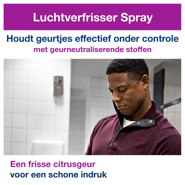 * Met de Tork luchtverfrisser spray met citrusgeur A1 ontdoe je elke sanitaire ruimte van onaangename geuren. * De combinatie van geconcentreerde geuroliën en geurneutraliserende middelen zorgen de hele dag voor frisse geur. * Plaats deze efficiënte luchtverfrisser in een spraydispenser van Tork en gebruik hem waar nodig. * De dispenser heeft flexibele instellingen voor de diverse soorten van sanitaire ruimten. * Bovendien is het onderhoud eenvoudig, waardoor u tijd en kosten bespaart. * Gevarenaanduidingen: H222, cat. 1: Zeer licht ontvlambare aerosol. H229, cat. 1, 2 en 3: Houder onder druk: kan openbarsten bij verhitting H319, cat. 2A: Veroorzaakt ernstige oogirritatie. * Veiligheidsaanbevelingen: P210: Verwijderd houden van warmte/vonken/open vuur/hete oppervlakken en andere ontstekingsbronnen. - Niet roken. P211: Niet in een open vuur of op andere ontstekingsbronnen spuiten. P251: Ook na gebruik niet doorboren of verbranden. P305+P351+P338: BIJ CONTACT MET DE OGEN: voorzichtig afspoelen met water gedurende een aantal minuten; contactlenzen verwijderen, indien mogelijk; blijven spoelen. P337+P313: Bij aanhoudende oogirritatie: een arts raadplegen. P410+P412: Tegen zonlicht beschermen. Niet blootstellen aan temperaturen boven 50 °C/122 °F.