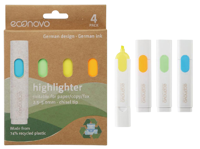 * Set van 4 markeerstiften met een groen, blauw, geel en oranje schrijfkleur. * Schrijfbreedte 2,5-5mm. * De markeerstiften zijn gemaakt van 74% gerecycled plastic. * De markeerstiften worden geleverd op een blister van kraft. Econovo staat voor: Less waste for a better planet!
