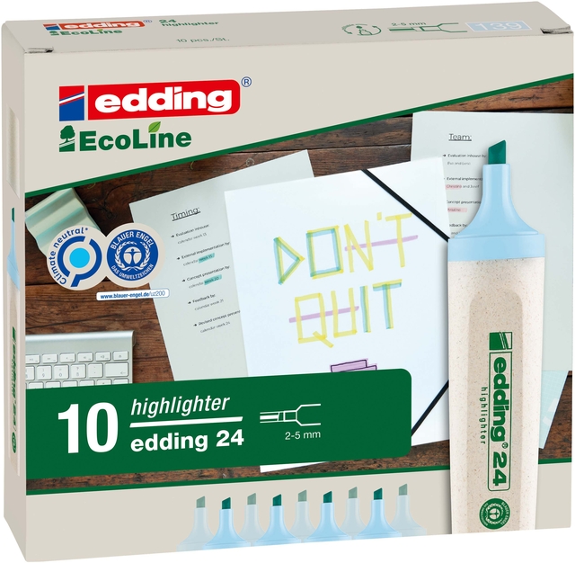 * Highlighter voor het opvallend markeren en highlighten van tekst en notities op vrijwel alle papieren oppervlakken. * Onderscheiden met het milieukeurmerk Blue Angel. * Minstens 90 % van de dop en barrel bestaat uit hernieuwbare grondstoffen. * Klimaatneutraal product volgens ClimatePartner-ID 13742-1910-1001. * De beitelvormige punt heeft een schrijfdikte van 2-5 mm. * De pastelkleurige inkt is op waterbasis, glanst zacht en loopt niet door op de volgende pagina. * Klimaatneutraal product, onderscheiden met het milieukeurmerk Blauer Engel. * Gemaakt in Duitsland. * Certificaat Green Brand 2021/2022.