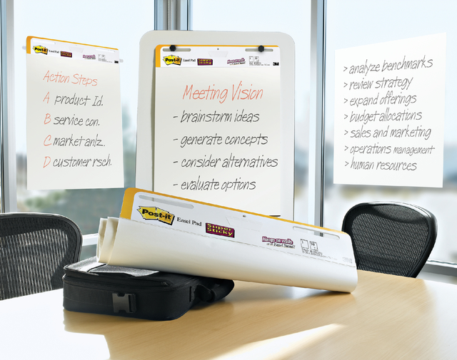 * De zelfklevende vellen plakken keer op keer op de meeste oppervlakken, blijven tot 2x langer plakken en kunnen worden verplaatst zonder schade aan het oppervlak. Tape of punaises zijn niet nodig, zoals bij standaard flipovervellen. * Post-it® Super Sticky Meeting Notes zijn supersterk, superveelzijdig en superopvallend. * De stevige achterzijde is voorzien van een handgreep voor makkelijk meenemen en heeft universele sleuven om te passen op de meeste ezels. * Effen wit papier van hoge kwaliteit dat bestand is tegen het doordrukken van markers. * Stop met het urenlang overschrijven van notities na een brainstormsessie; download de gratis Post-it® App. Je kunt je notities nu direct vastleggen en opslaan, zodat je ze snel met je team kunt delen zonder dat je eerst een verslag hoeft te maken. * Meeting Charts: Effen wit papier. 30 vellen per blok, elk vel meet 63,5 x 76,2 cm.