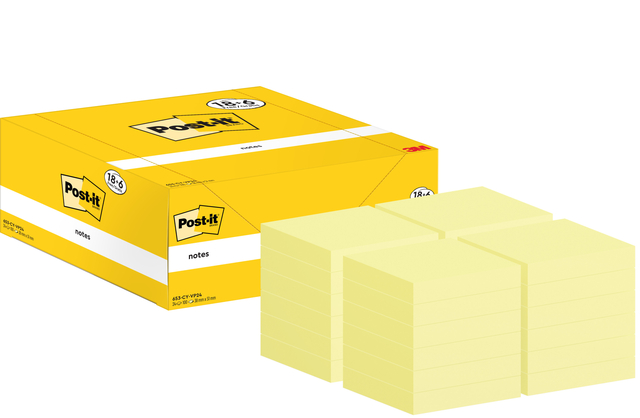 * Maak een notitie, stuur een berichtje of laat een geheugensteuntje achter met Post-it® Notes Canary Yellow. * Deze klassieke Post-it® Notes zijn ideaal voor jou en je vrienden of collega's om belangrijke informatie te helpen onthouden. * Zelfklevende notitieblaadjes zijn een duidelijke, eenvoudige en effectieve manier om alles netjes en georganiseerd te houden en je werk goed te laten verlopen. * Post-it® Notes zijn gemaakt van papiervezels met PEFC-certificering, afkomstig uit duurzaam beheerde bossen en gecontroleerde bronnen. * De verpakking van gerecycleerd karton kan worden gebruikt om je sticky notes makkelijk op te slaan in je bureau of kast en kan worden gerecycleerd zodra je die niet meer nodig hebt. * Afmeting: 38mm x 51mm. * 100 Vellen per blok. Voordeelpak 24 blokken(18 + 6).