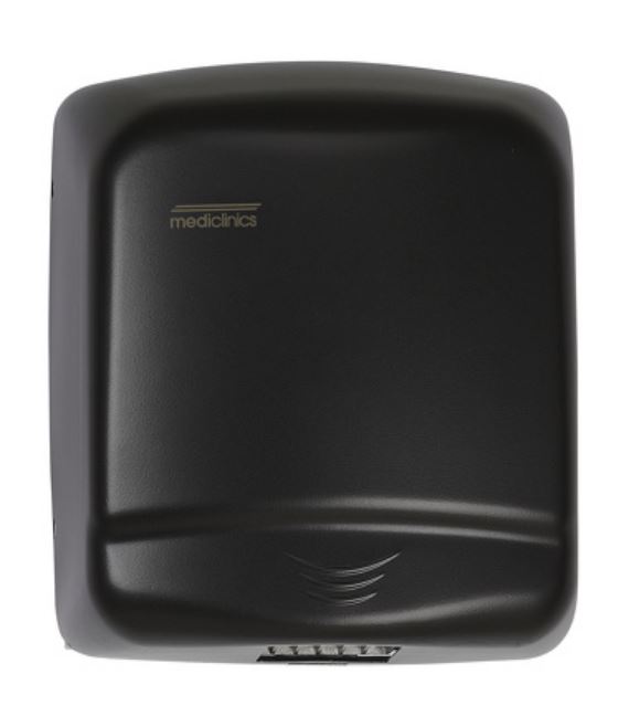 Automatische zwarte handendroger 1100 Watt. Bruto luchtopbrengst ca. 27l_sec. Luchtsnelheid: 85 km_u. Luchttemperatuur 47 gr. C. 60dB. Droogtijd: 39 seconden. Afmetingen hxbxd: 258x145x138 mm. Toepassing: Wandmontage