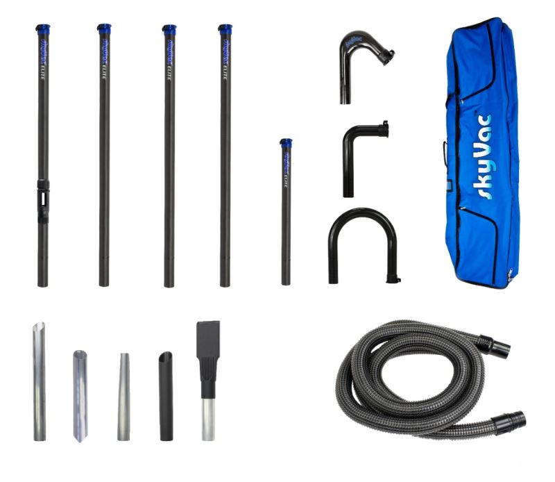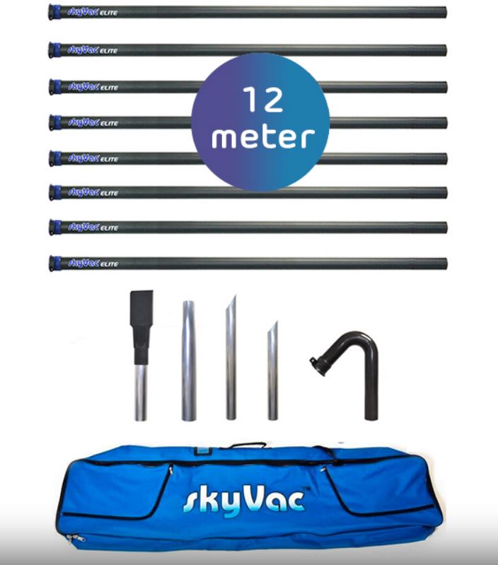 Met het SkyVac Elite buizensysteem kan men eenvoudig en veilig tot 6 meter hoogte reinigen vanaf de grond. De set buizen weegt slechts 280 gram per buis van 15 meter. Dit is de lichtste verhouding tussen gewicht en grootte in deze markt maar toch zijn deze buizen ook enorm sterk. Bij de set zit een carbon buis met by-pass schuif. Deze innovatieve en ultralichte carbonbuis is in staat om grote stukken die niet opgezogen kunnen worden veilig en efficient te verwijderen zonder de buizen te laten zakken of het zuigen te onderbreken. De buizen beschikken verder over een klem waardoor deze eenvoudig met andere buizen te verbinden zijn. Tevens zorgen deze klemmen voor extra stabiliteit.