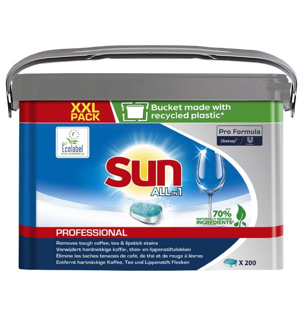 Vaatwastabletten voor uitstekende vuilverwijdering. Makkelijk doseerbaar en geschikt voor alle waterhardheden. Verwijdert ook hardnekkige vlekken zoals koffie thee en lippenstift. 100Proc wateroplosbaar sachet. Bij de normale tabletten en poeder dient u zelf Sun spoelglans en zout toe te voegen. Bij de Allin1 variant is dit ingebouwd in de tablet.