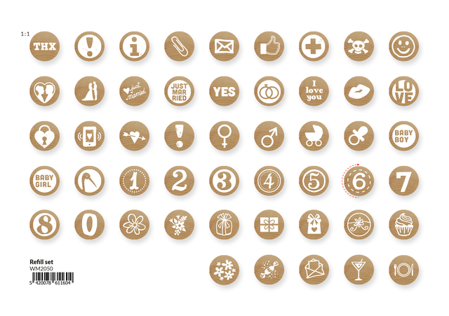 * Deze Mini Woodies navulset bevat maar liefst 250 kleine stempels. * Er zijn 50 verschillende motieven beschikbaar. * Iedere stempel heeft een diameter van 15mm.