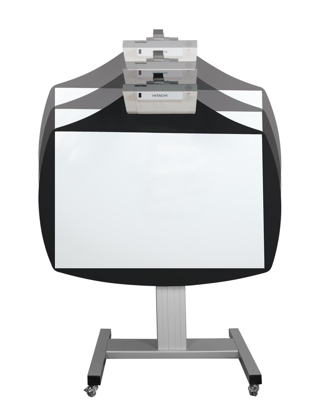 Het mobiele in hoogte en kantelbare interactieve bordsysteem Onze elektrisch in hoogte verstelbare en kantelbare interactieve whiteboards zijn geschikt voor plaatsing in de ruimte. De verstelbare mast bestaat uit 2 telescopische aluminium profielen waarin de motor is weggewerkt. Met behulp van twee op het systeem bevestigde knoppen kan het whiteboard in cloudboard-design elektrisch in hoek en voor elke gebruiker op de juiste hoogte worden versteld. Voordeel van elektrische hoogteverstelling: Verhoogde levensduur van de projectorlamp en de projector, omdat gecontroleerde beweging dure technologie beschermt. Voorbij zijn de dagen van vervelende witte marges! Het projectiegebied van het whiteboard is uitzonderlijk B/H: 1,44 x 0,90 m. Met een 16:10 formaat van de projector wordt het gehele centrale gebied verlicht. Benut 100% van de prestaties van uw projector. Het zwarte frame rond het voor projectie geoptimaliseerde middenvlak zorgt voor een optimaal contrast en een haarscherp beeld. Het whiteboard is elektrisch in hoogte te verstellen en zowel in de schoolbord- als tafelmodus tot 90 graden te kantelen. Het systeem kan gebruikt worden als touchscreen tafel. U kunt het whiteboard onder elke hoek stopzetten. Het stabiele onderstel beschikt over 4 zware zwenkwielen waarvan er 2 vergrendelbaar zijn om het whiteboard op de gewenste plek te bevestigen.