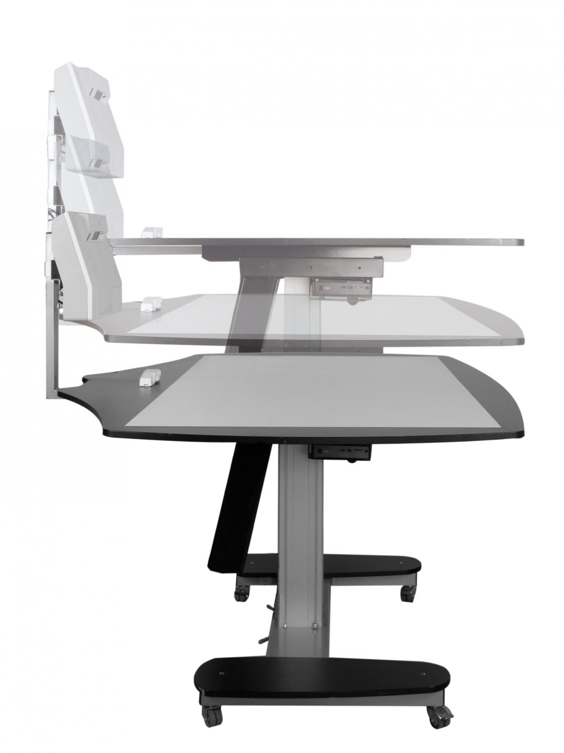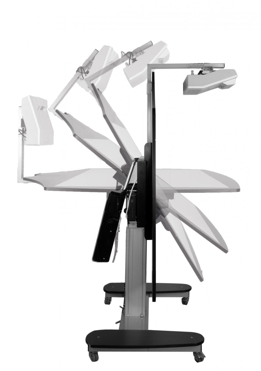 Het mobiele in hoogte en kantelbare interactieve bordsysteem Onze elektrisch in hoogte verstelbare en kantelbare interactieve whiteboards zijn geschikt voor plaatsing in de ruimte. De verstelbare mast bestaat uit 2 telescopische aluminium profielen waarin de motor is weggewerkt. Met twee op het systeem bevestigde knoppen kan het whiteboard in cloudboard-design elektrisch in hoek en voor elke gebruiker op de juiste hoogte worden versteld. Voordeel van elektrische hoogteverstelling: Verhoogde levensduur van de projectorlamp en de projector, omdat gecontroleerde beweging dure technologie beschermt. Voorbij zijn de dagen van vervelende witte marges! Het projectiegebied van het whiteboard is uitzonderlijk B/H: 1,60 x 1,00 m. Met een 16:10 formaat van de projector wordt het gehele centrale gebied verlicht. Benut 100% van de prestaties van uw projector. Het zwarte frame rond het voor projectie geoptimaliseerde middenvlak zorgt voor een optimaal contrast en een haarscherp beeld. Het whiteboard is elektrisch in hoogte te verstellen en zowel in de schoolbord- als tafelmodus tot 90 graden te kantelen. Het systeem kan gebruikt worden als touchscreen tafel. U kunt het whiteboard onder elke hoek stopzetten. Het stabiele onderstel beschikt over 4 zware zwenkwielen waarvan er 2 vergrendelbaar zijn om het whiteboard op de gewenste plek te bevestigen.