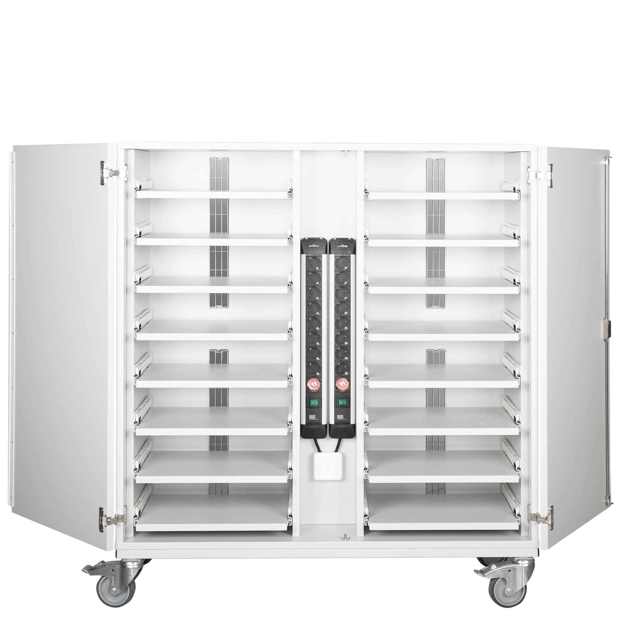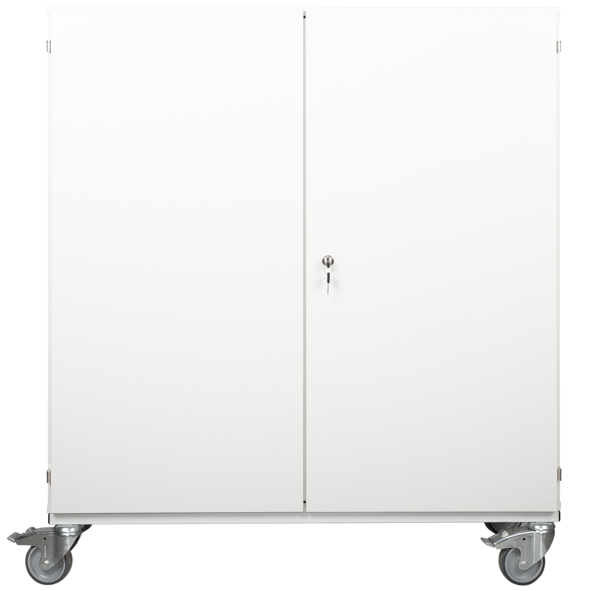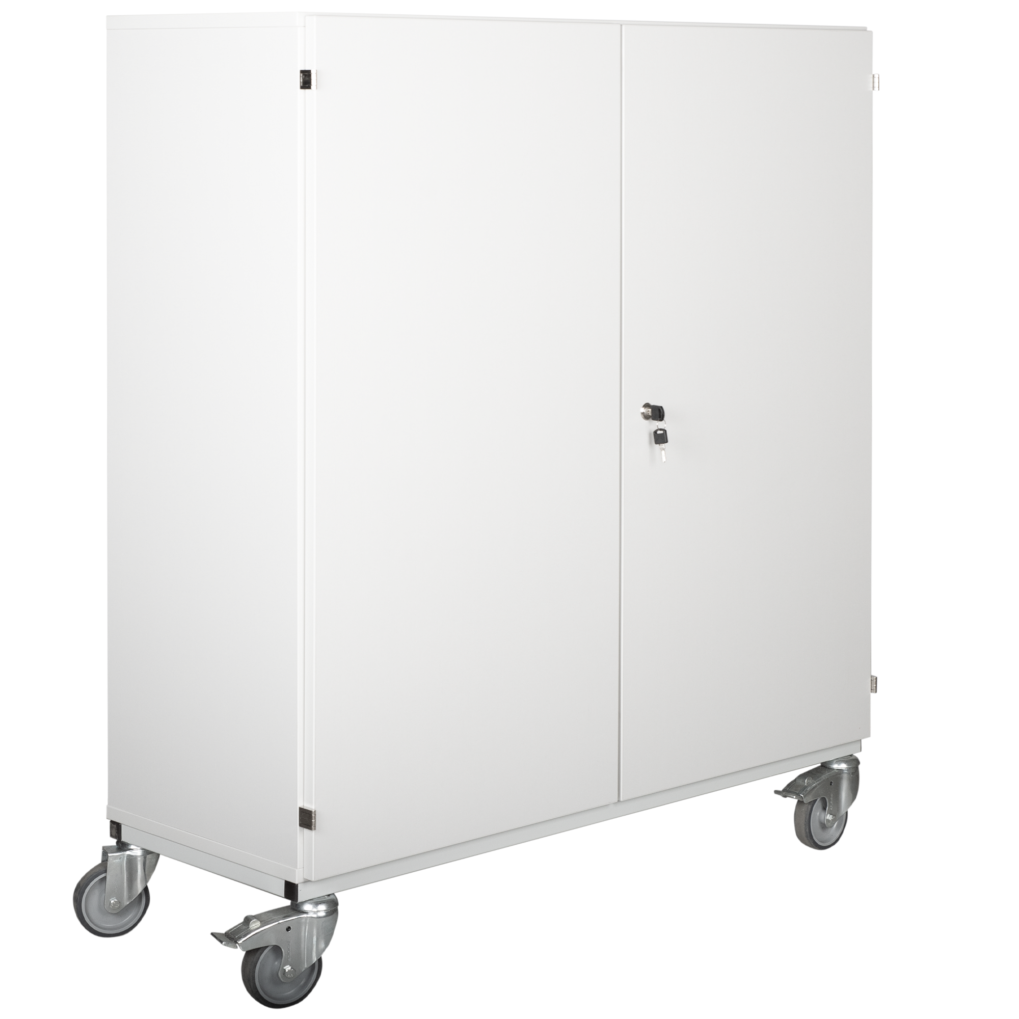 De notebooktrolley met twee vleugeldeuren biedt plaats aan 16 notebooks tot 17" (vakbreedte: 50 cm). In het midden bevinden zich twee stekkerdozen met elk 9 stopcontacten, die afzonderlijk in- en uitgeschakeld kunnen worden. Er zijn twee verticale ventilatieroosters aan de achterzijde.Verrijdbaar op vier zwenkwielen waarvan twee vergrendelbaar.Onze kasten zijn gemaakt van 19 mm dik hoogwaardig E1 fijn spaanplaat, de zijwanden staan op de vloer.Alle aansluitingen zijn deuvel- en verlijmd en , in het geval van hoge kasten, hebben ook verbindingsbeslag.Dit ontwerp zorgt voor een enorme stabiliteit en stabiliteit.2 mm dikke ABS-rand beschermt de karkasranden tegen vocht en stoten, waardoor de levensduur van de kasten wordt verlengd.De verzonken achterwand van 8 mm zorgt ervoor dat u vrij positioneer de kast - of het nu aan de muur is of vrij in de ruimte. Het kastoppervlak is afgewerkt met een hoogwaardige melamineharscoating en verkrijgbaar in veel verschillende decors. Het kan met een vochtige doek worden afgeveegd en is probleemloos bestand tegen het dagelijkse schoolleven.