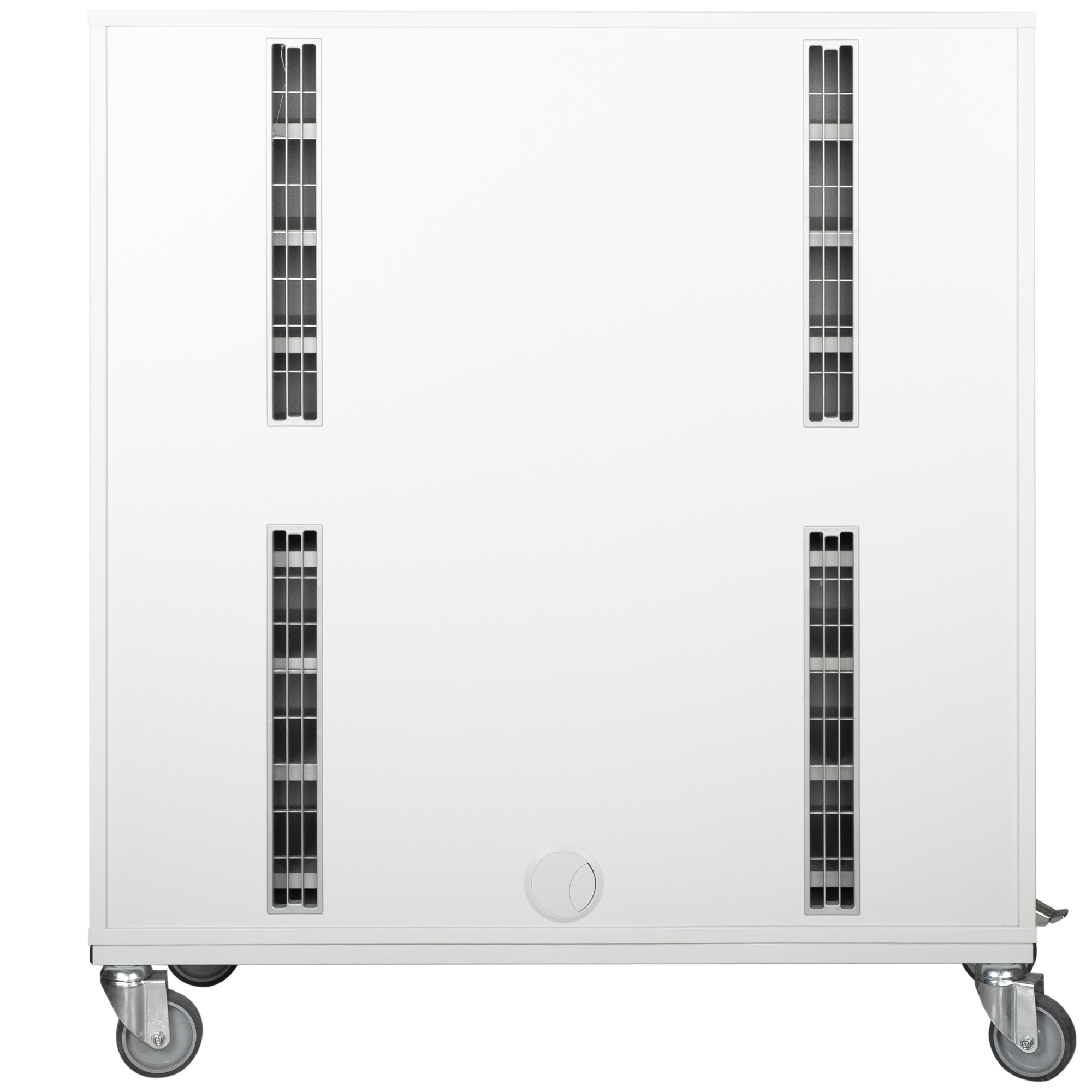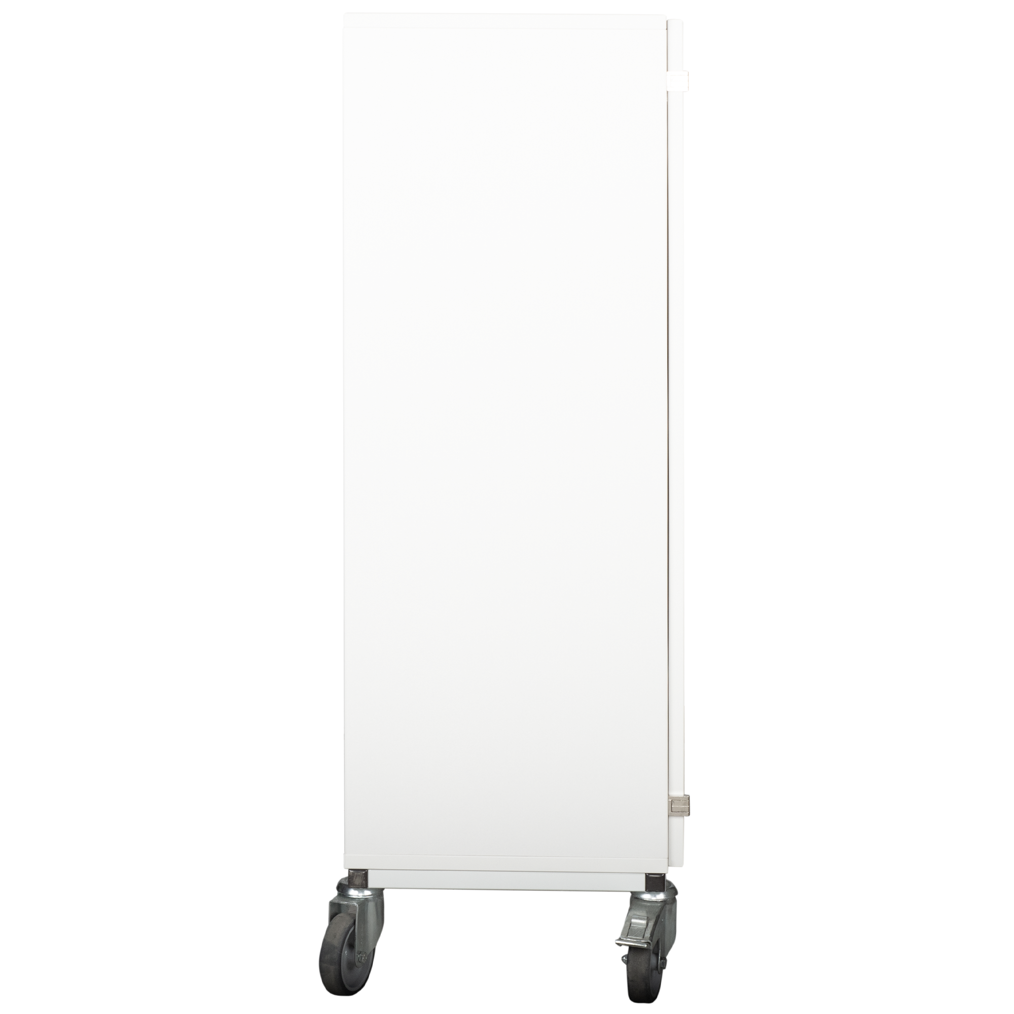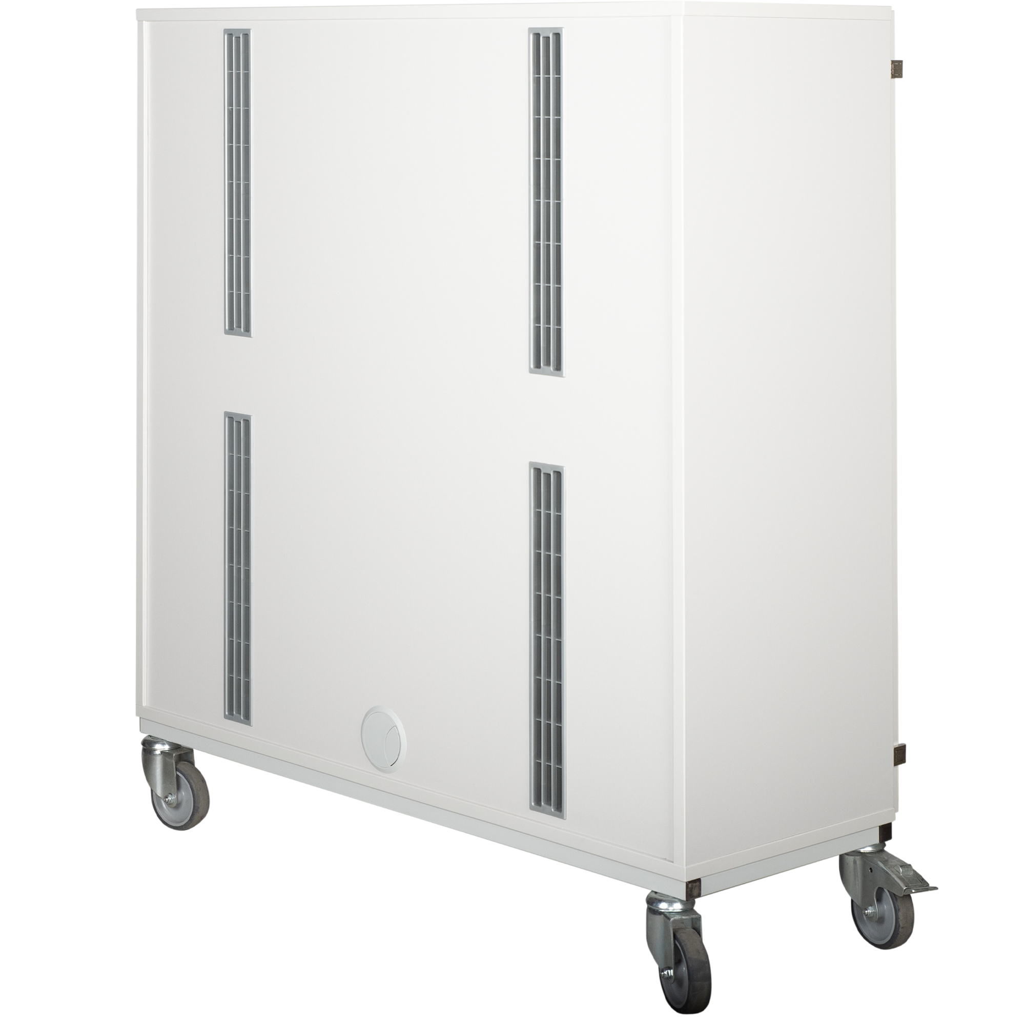 De notebooktrolley met twee vleugeldeuren biedt plaats aan 16 notebooks tot 17" (vakbreedte: 50 cm). In het midden bevinden zich twee stekkerdozen met elk 9 stopcontacten, die afzonderlijk in- en uitgeschakeld kunnen worden. Er zijn twee verticale ventilatieroosters aan de achterzijde.Verrijdbaar op vier zwenkwielen waarvan twee vergrendelbaar.Onze kasten zijn gemaakt van 19 mm dik hoogwaardig E1 fijn spaanplaat, de zijwanden staan op de vloer.Alle aansluitingen zijn deuvel- en verlijmd en , in het geval van hoge kasten, hebben ook verbindingsbeslag.Dit ontwerp zorgt voor een enorme stabiliteit en stabiliteit.2 mm dikke ABS-rand beschermt de karkasranden tegen vocht en stoten, waardoor de levensduur van de kasten wordt verlengd.De verzonken achterwand van 8 mm zorgt ervoor dat u vrij positioneer de kast - of het nu aan de muur is of vrij in de ruimte. Het kastoppervlak is afgewerkt met een hoogwaardige melamineharscoating en verkrijgbaar in veel verschillende decors. Het kan met een vochtige doek worden afgeveegd en is probleemloos bestand tegen het dagelijkse schoolleven.