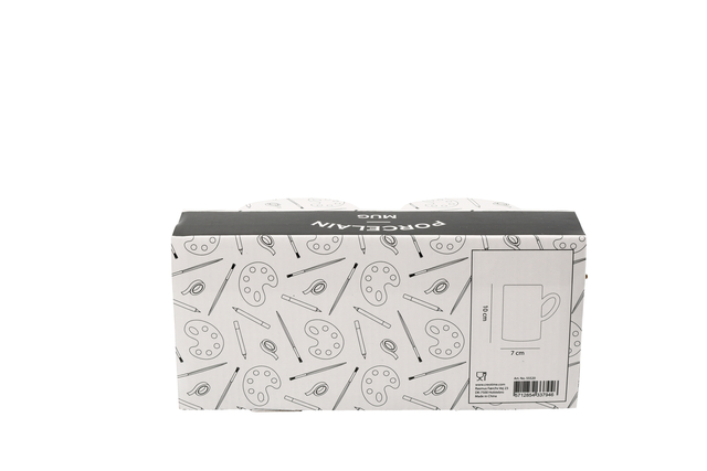 * Porseleinen mok met oor, die je kunt opleuken en personaliseren. * De beker is geschikt voor warme en koude dranken. * Het stevige oor geeft een goede en stabiele grip. * Als je de mok wilt versieren, zorg er dan voor dat het oppervlak volledig schoon, vetvrij en droog is. * Wil je je mok verven, gebruik dan een verf die bestand is tegen de hete temperaturen in de vaatwasser. * Daardoor blijft je mooie kunstwerk langer mooi. * Denk er ook aan de aanwijzingen te volgen over het uitharden van de verf in de oven. * Mok van porselein kun je decoreren met glas- en porseleinstiften of glas- en porseleinverf. * Afmetingen: hoogte 10cm, diameter 7,4cm. * Kleur: wit. * Set à 2 stuks.