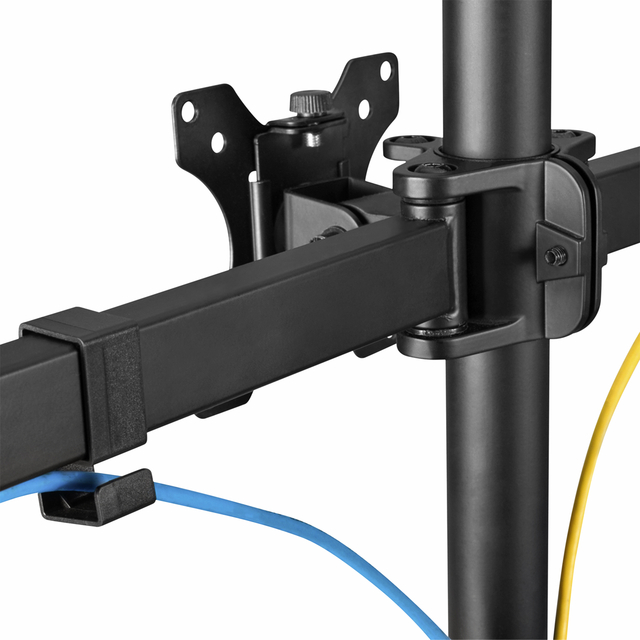 * Met deze monitorarm bevestigt u drie flatscreen monitoren van maximaal 27" aan het bureau via een bureauklem of bladdoorvoer. * Door gebruik te maken van een monitorarm profiteert u optimaal van de mogelijkheden van uw monitor en bespaart u ruimte op uw bureau. * De monitorarm is eenvoudig in hoogte en diepte te verstellen. * Tevens kunt u de schermen kantelen, zwenken en roteren. * Hierdoor creëert u de ideale ergonomische werkhouding. * Dit verkleint de kans op nek- en rugklachten. * Kabels zijn netjes weg te werken aan de onderzijde van de horizontale armen. * De arm heeft 3 draaipunten en is geschikt voor drie schermen van maximaal 27". * Het draagvermogen van de arm is 7 kg per scherm. * Dit product is geschikt voor schermen met een VESA gatenpatroon van 75x75 mm of 100x100 mm.