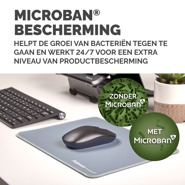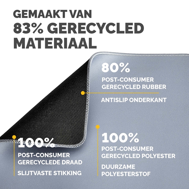 Meer dan 25% groter dan onze standaard muismatten voor meer bewegingsvrijheid, waardoor kleine herhaalde bewegingen die pijn in de pols kunnen veroorzaken, worden verminderd. Bescherm uw bureaublad en verbeter de prestaties van uw muis met deze muismatten die geschikt zijn voor optische en lasermuizen. De ingebouwde Microban®-bescherming helpt de groei van bacteriën te voorkomen en werkt 24/7 voor een extra bescherming van het product. Gemaakt van 83% gerecycled materiaal. De antislipbasis houdt de muismat de hele dag op zijn plaats. Duurzame platte stiksels voorkomen rafelen. Gemaakt om lang mee te gaan, met 5 jaar garantie.