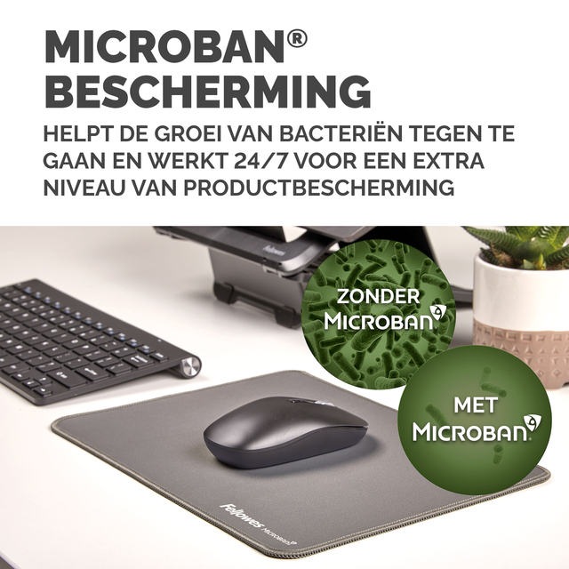 Meer dan 25% groter dan onze standaard muismatten voor meer bewegingsvrijheid, waardoor kleine herhaalde bewegingen die pijn in de pols kunnen veroorzaken, worden verminderd. Bescherm uw bureaublad en verbeter de prestaties van uw muis met deze muismatten die geschikt zijn voor optische en lasermuizen. De ingebouwde Microban®-bescherming helpt de groei van bacteriën te voorkomen en werkt 24/7 voor een extra bescherming van het product. Gemaakt van 83% gerecycled materiaal. * De antislipbasis houdt de muismat de hele dag op zijn plaats. Duurzame platte stiksels voorkomen rafelen. Gemaakt om lang mee te gaan, met 5 jaar garantie.