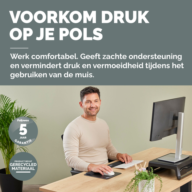 De HEX Cushion Technology™, waarvoor patent is aangevraagd, zorgt voor een gelijkmatige ondersteuning en supercomfort tijdens het muisgebruik. De zachte, stofwerende polssteun heeft een mooie afwerking en zorgt voor een soepele muiservaring. De ingebouwde Microban®-bescherming helpt de groei van bacteriën tegen te gaan en werkt 24/7 voor extra bescherming van het product. Bescherm je bureau en verbeter de prestaties van je muis met deze muismat die geschikt is voor optische en lasermuizen. Gemaakt van 69% gerecycled materiaal en 100% recyclebaar met het terugnameprogramma van Fellowes. Gemaakt om lang mee te gaan met 5 jaar beperkte garantie. Getest door FIRA International Ltd om te voldoen aan de ergonomische eisen van de Europese gezondheids- en veiligheidswetgeving: EN ISO 9241-5.