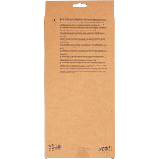 Niet-permanente acrylstiften op waterbasis met volle kleuren en een stevige vilten punt. Te gebruiken op steen, papier, canvas, glas, porselein, plastiek, hout, karton en metaal. De verf is echter vrij waterbestendig als hij droog is. De stift heeft een vaste vilten punt van 4mm dik. Belangrijk: Bewaar liggend met de dop erop, maar als de punt uitdroogt, kunt u hem op het papier stippen tot de inkt weer in de punt stroomt. * Set à 12 kleuren.