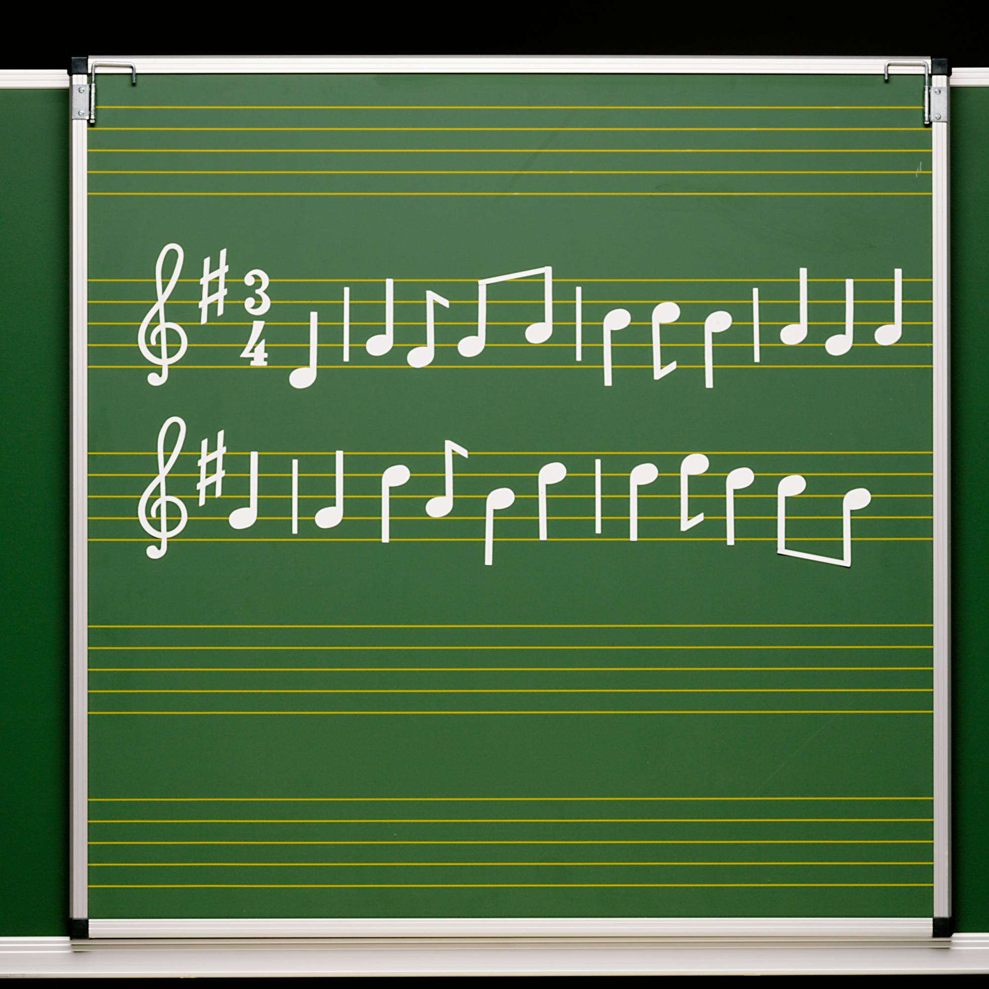 Ons muziekbord met ophanghaak en gestandaardiseerde muziekliniaal nr. 11, om aan klasborden te hangen. Het muziekbord kan eenvoudig over de muur worden gehangen, is met krijt te beschrijven en met een vochtige doek schoon te vegen. Het is ook magnetisch en kan worden uitgerust met elke magneet. Het oppervlak bestaat uit staal geëmailleerd groen met gele lijnen.
