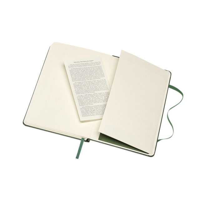 * Dit Moleskine notitieboek is een trouwe reisgezel is ideaal voor teksten, gedachten en briefjes. Het boek beschikt over een gebonden, kartonnen kaft met afgeronde hoeken, zuurvrij papier, een bladwijzer, een elastische sluiting en een uitbreidbaar binnenvak met een tekst over de geschiedenis van Moleskine. * Kenmerken: afgeronde hoeken, elastische sluiting, ivoorkleurig Moleskine-papier, bijpassend leeslint, papier: 70 gsm, zuurvrij, “In geval van verlies”-label op het schutblad, uitbreidbaar binnenvak op achterkaft. * Herbruikbare papierband heeft B-kant met extra gedrukte hulpmiddelen. * Platliggend, opent 180°. Moleskine S.p.A. maakt en verkoopt FSC & gecertificeerde producten.