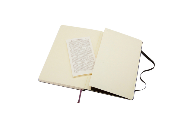 * Dit Moleskine notitieboek is een trouwe reisgezel is ideaal voor teksten, gedachten en briefjes. Het boek beschikt over een gebonden, kartonnen kaft met afgeronde hoeken, zuurvrij papier, een bladwijzer, een elastische sluiting en een uitbreidbaar binnenvak met een tekst over de geschiedenis van Moleskine. * Kenmerken: afgeronde hoeken, elastische sluiting, ivoorkleurig Moleskine-papier, bijpassend leeslint, papier: 70 gsm, zuurvrij, “In geval van verlies”-label op het schutblad, uitbreidbaar binnenvak op achterkaft. * Herbruikbare papierband heeft B-kant met extra gedrukte hulpmiddelen. * Platliggend, opent 180°. Moleskine S.p.A. maakt en verkoopt FSC & gecertificeerde producten.