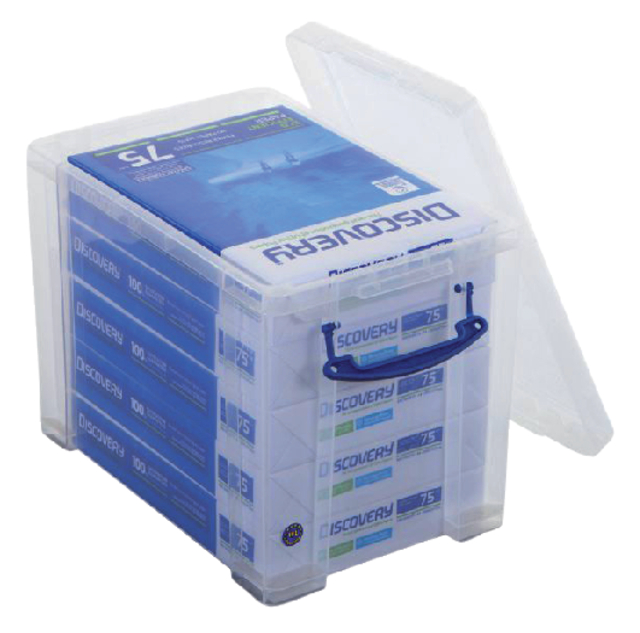 * Really Useful opbergboxen zijn stapelbaar met of zonder deksel. * Ze zijn zo sterk dat het het gewicht van één persoon houdt. * Elk product is bestendig tegen temperaturen van -15°C tot +80°C. * Minimale zijkant aanpassingen om opbergruimte te maximaliseren, dit zorgt tevens ook dat de inhoud minder kan bewegen tijdens transport. * Volledig platte en versterkte bodem. * Het sluitmechanisme houdt de doos en het deksel tezamen. * De doorzichtige doos heeft het voordeel dat u steeds de inhoud ziet. * De verschillende afmetingen zijn onderling opstapelbaar. * Geschikt voor A4 hangmappen.