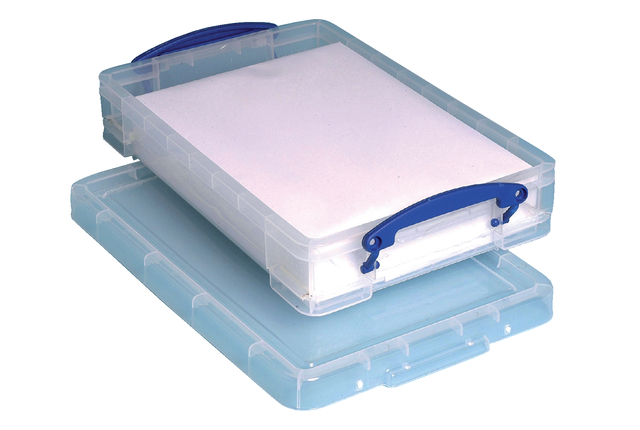 * Really Useful opbergboxen zijn stapelbaar met of zonder deksel. * Ze zijn zo sterk dat het het gewicht van één persoon houdt. * Elk product is bestendig tegen temperaturen van -15°C tot +80°C. * Minimale zijkant aanpassingen om opbergruimte te maximaliseren, dit zorgt tevens ook dat de inhoud minder kan bewegen tijdens transport. * Volledig platte en versterkte bodem. * Het sluitmechanisme houdt de doos en het deksel tezamen. * De doorzichtige doos heeft het voordeel dat u steeds de inhoud ziet. * De verschillende afmetingen zijn onderling opstapelbaar. * Geschikt voor 500vel A4 papier. * Afmetingen buitenmaat: 395x255x85mm ( dit is incl deksel) binnenmaat: 335x210x70mm.