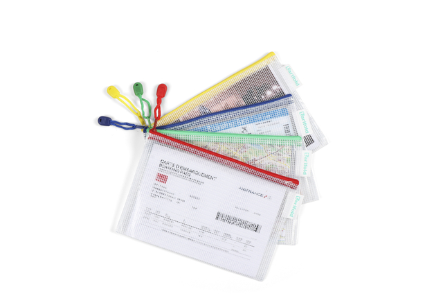 * Versterkte transparante chequeboekformaat opbergtassen met ritssluiting.
