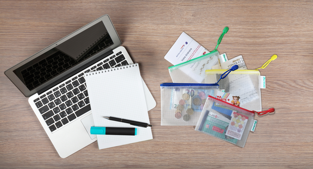 Monsters, chequeboekjes, reisbonnen en documenten, tickets, kleine voorwerpen, school- en kantoorbenodigdheden, toiletartikelen, medicijnen, enz.