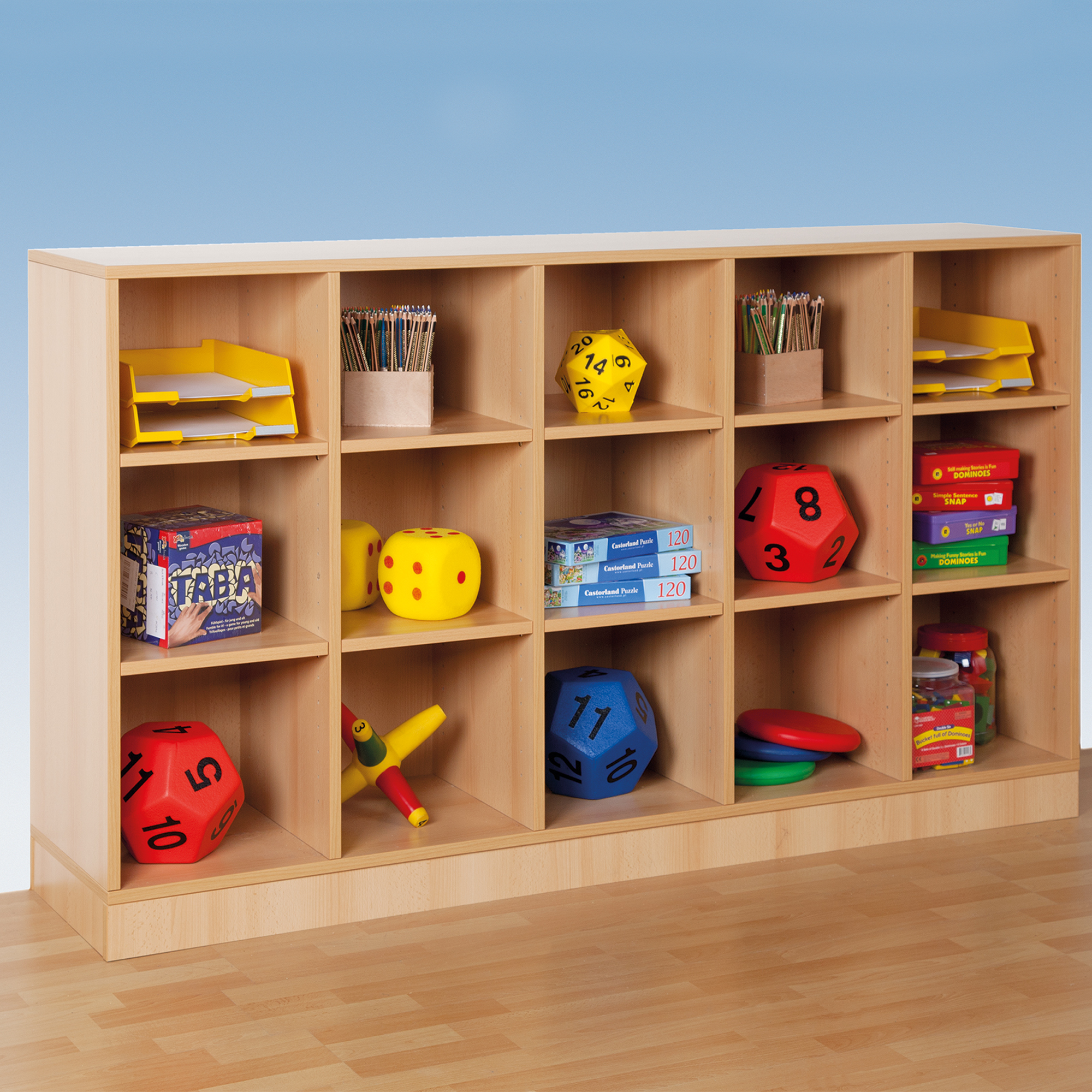 De open boekenrek biedt opbergruimte voor de hoogte van 3 mappen. De 15 open vakken zijn gescheiden met 4 tussenwanden. Met 10 legborden kan de hoogte van de 15 vakken worden gevarieerd in een raster van 32 mm. De planken in onze kasten zijn voorzien van een uittrekbeveiliging die voorkomt dat ze onbedoeld worden uitgetrokken. Onze kasten zijn gemaakt van 19 mm dikke, hoogwaardige E1 fijnspaanplaat, de zijwanden liggen op de vloer. Alle verbindingen zijn met pluggen en verlijmd en hebben bij hoge kasten ook verbindingsbeslag. Dit ontwerp zorgt voor een enorme stabiliteit en stabiliteit. ABS-kanten met een dikte van 2 mm beschermen de karkasranden tegen vocht en stoten en verlengen zo de levensduur van de kasten. Dankzij de ingebedde 8 mm zichtbare achterwand bent u vrij om de kast te plaatsen - of het nu tegen de muur is of vrij in de kamer. Het corpusoppervlak is afgewerkt met een hoogwaardige melamineharscoating en is verkrijgbaar in veel verschillende decors. Het kan met een vochtige doek worden afgeveegd en is probleemloos bestand tegen het dagelijkse schoolleven.