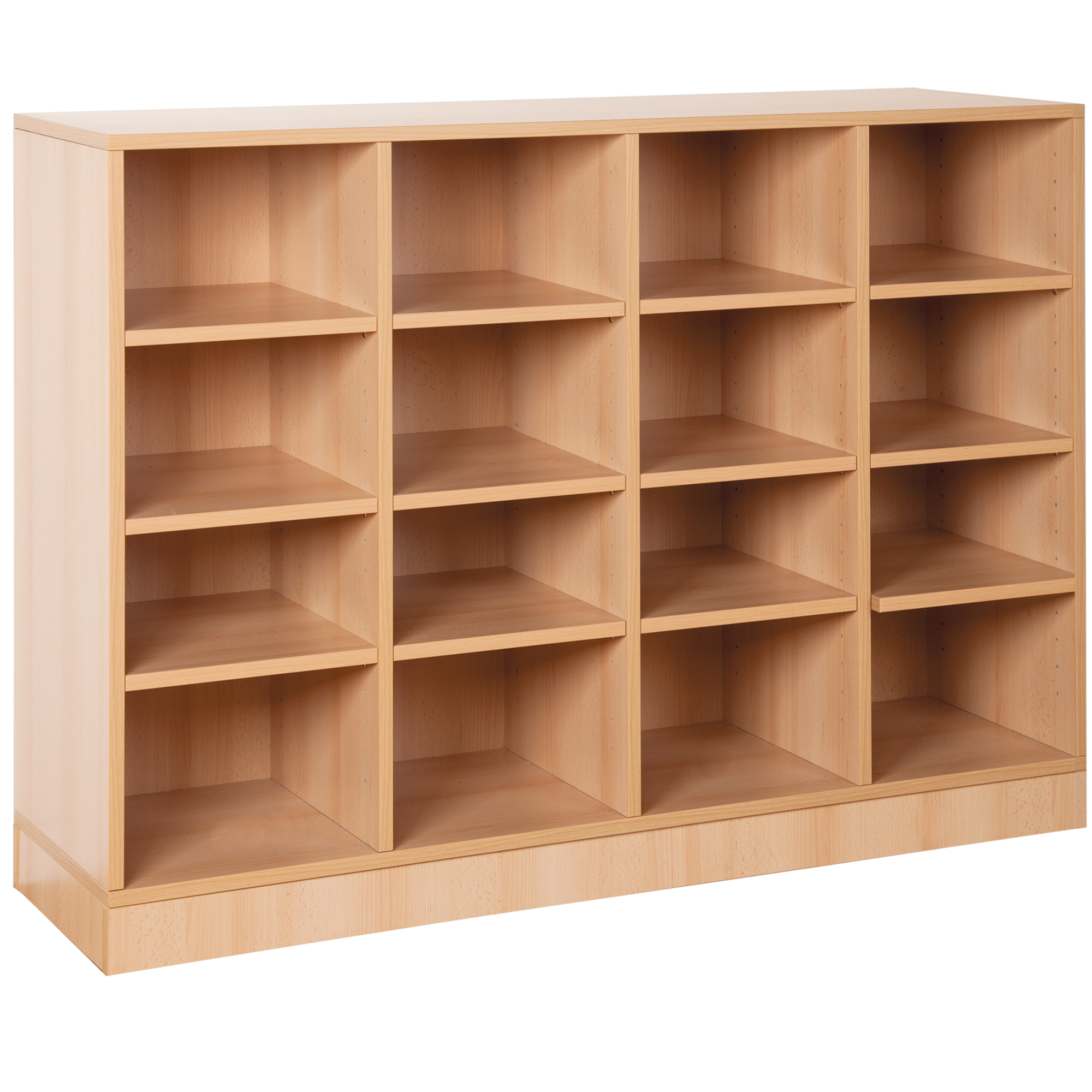 De open boekenrek biedt opbergruimte voor de hoogte van 4 mappen. De 16 open vakken zijn gescheiden met 3 tussenwanden. Met 12 legborden kan de hoogte van de 12 vakken naar wens gevarieerd worden in een raster van 32 mm. De planken in onze kasten zijn voorzien van een uittrekbeveiliging die voorkomt dat ze onbedoeld worden uitgetrokken. Onze kasten zijn gemaakt van 19 mm dikke, hoogwaardige E1 fijnspaanplaat, de zijwanden liggen op de vloer. Alle verbindingen zijn met pluggen en verlijmd en hebben bij hoge kasten ook verbindingsbeslag. Dit ontwerp zorgt voor een enorme stabiliteit en stabiliteit. ABS-kanten met een dikte van 2 mm beschermen de karkasranden tegen vocht en stoten en verlengen zo de levensduur van de kasten. Dankzij de ingebedde 8 mm zichtbare achterwand bent u vrij om de kast te plaatsen - of het nu tegen de muur is of vrij in de kamer. Het corpusoppervlak is afgewerkt met een hoogwaardige melamineharscoating en is verkrijgbaar in veel verschillende decors. Het kan met een vochtige doek worden afgeveegd en is probleemloos bestand tegen het dagelijkse schoolleven.