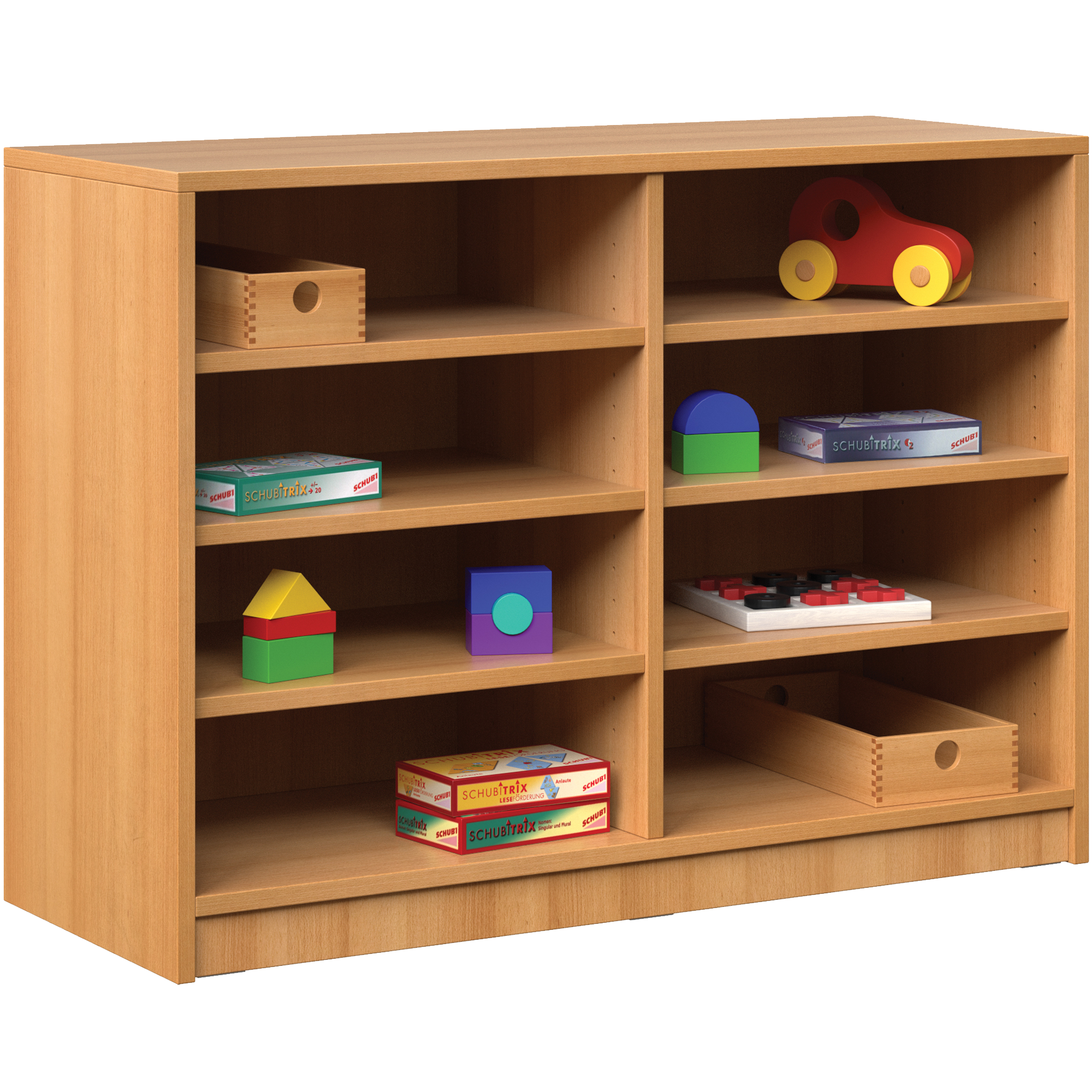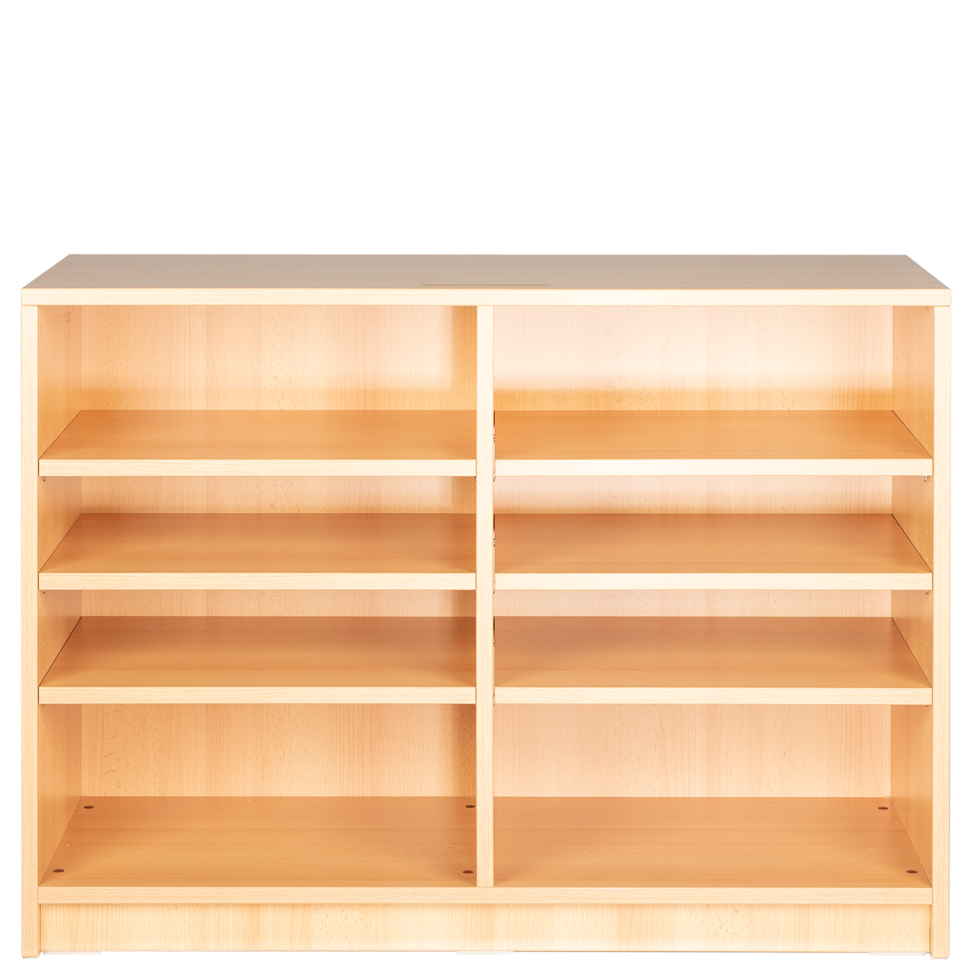 In combinatie met de vrij verstelbare houten kisten uit de series HK 1 tot HK 8 is dit rek ideaal voor het opbergen. Met 6 legborden kan de hoogte van de 8 vakken worden gevarieerd in een raster van 32 mm. De planken in onze kasten zijn voorzien van een uittrekbeveiliging die voorkomt dat ze onbedoeld worden uitgetrokken. Onze kasten zijn gemaakt van 19 mm dikke, hoogwaardige E1 fijnspaanplaat, de zijwanden liggen op de vloer. Alle verbindingen zijn met pluggen en verlijmd en hebben bij hoge kasten ook verbindingsbeslag. Dit ontwerp zorgt voor een enorme stabiliteit en stabiliteit. ABS-kanten met een dikte van 2 mm beschermen de karkasranden tegen vocht en stoten en verlengen zo de levensduur van de kasten. Dankzij de ingebedde 8 mm zichtbare achterwand bent u vrij om de kast te plaatsen - of het nu tegen de muur is of vrij in de kamer. Het corpusoppervlak is afgewerkt met een hoogwaardige melamineharscoating en is verkrijgbaar in veel verschillende decors. Het kan met een vochtige doek worden afgeveegd en is probleemloos bestand tegen het dagelijkse schoolleven.