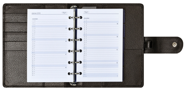 * Pocket runderleer organizer met drukknop sluiting. * Er is binnenin aan de linker- en rechterkant ruimte voor cards en papieren. * Onder de sluitclip is ruimte voor een pen. * Buitenafmeting organizer: 145x120x30mm. * Afmeting papier in Junior agenda: 125x80mm. * Deze organizer wordt geleverd incl agenda van 1 week op 2 pagina’s. * De organizer is voorzien van tabbladen, doorzichtig vak met rits, pagina-scheider, notitieblaadjes en adresboekje. * Het calendarium bevat ruimte voor persoonlijke gegevens, kalenders en planners voor lopend en volgend jaar. * De individuele dagen vermelden bovendien veel religieuze en (inter)nationale feest- en herdenkingsdagen.