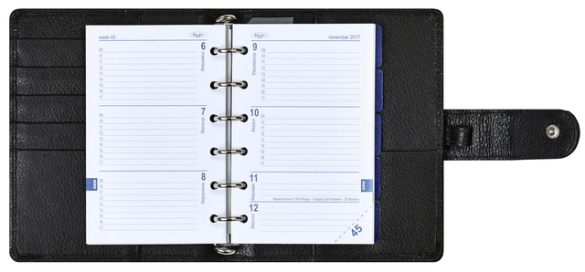 * Pocket runderleer organizer met drukknop sluiting. * Er is binnenin aan de linker- en rechterkant ruimte voor cards en papieren. * Onder de sluitclip is ruimte voor een pen. * Buitenafmeting organizer: 145x120x30mm. * Afmeting papier in agenda: 125x80mm. * Deze organizer wordt geleverd incl agenda van 1 week op 2 pagina’s. * De organizer is voorzien van tabbladen, doorzichtig vak met rits, pagina-scheider, notitieblaadjes en adresboekje. * Het calendarium bevat ruimte voor persoonlijke gegevens, kalenders en planners voor lopend en volgend jaar. * De individuele dagen vermelden bovendien veel religieuze en (inter)nationale feest- en herdenkingsdagen.