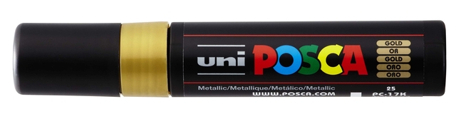 De PC-17K met extra brede punt van 15mm is de expert van het POSCA-gamma. Met zijn XXL-patroon, is hij de bondgenoot van kunstenaars en professionals voor gigantische ontwerpen en uitvoeringen. De PC-17K is geschikt voor kunstenaars om foutloze achtergronden op grote doeken te schilderen, live grote werken uit te voeren; voor liefhebbers van home deco om een tweede leven te geven aan een ruimte, een meubel, een stof of een omvangrijk voorwerp; voor professionals om etalages of displays te versieren. . Toepasbaar op papier, plastic, glas, textiel, hout, steen, porcelein enzovoorts. Perfect om unieke ontwerpen mee te maken, voor zowel binnenshuis als buitenshuis. De pigment-houdende inkt is op water basis en is reukloos in gebruik. * Geschikt voor alle ondergronden. * Hoge UV weerstand. * Dekkende ondoorzichtige kleuren. * Uitwasbaar. * Mengbaar. * Aquerelleerbaar. * Overschilderbaar. * Kleur: goud.