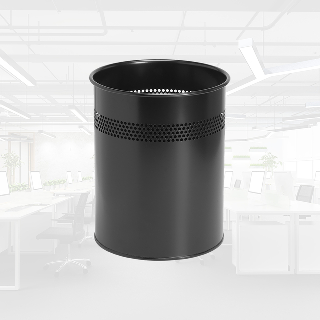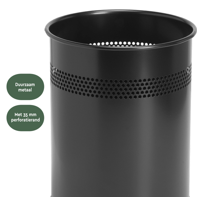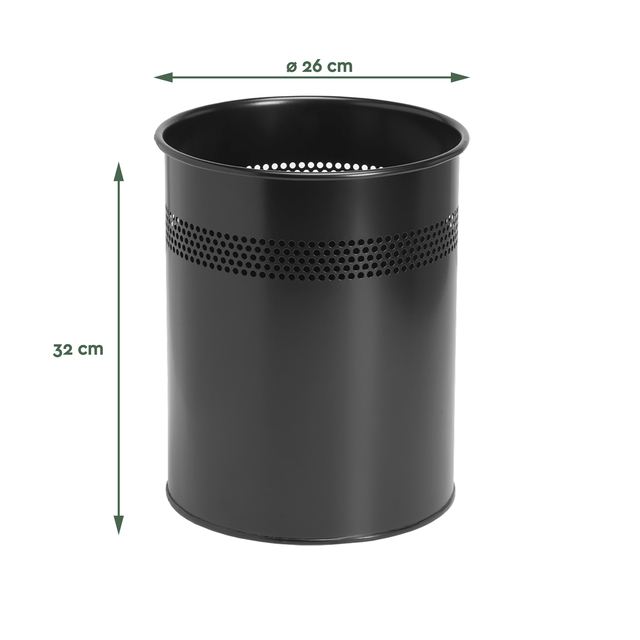* Decoratieve en elegante papierbak. * Met decoratieve perforatierand van 30mm. * Voorzien van sterke epoxy laklaag. * De poedercoating is op waterbasis en oplosmiddelvrij. * Inhoud 15 liter. * Ø260mm, hoogte 315mm.