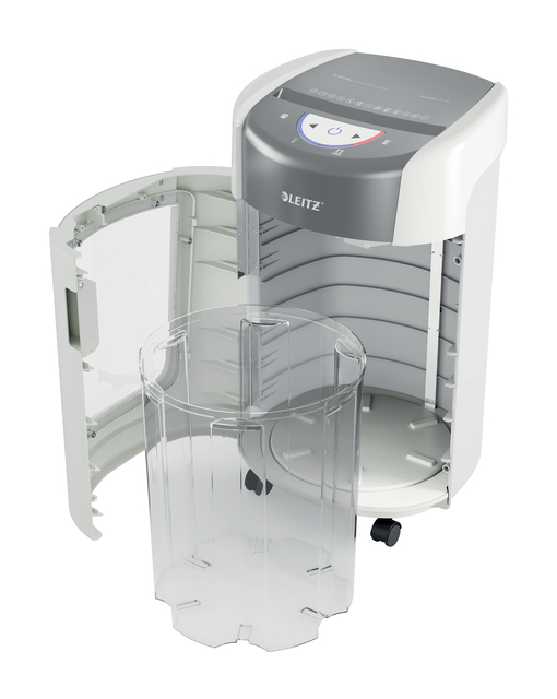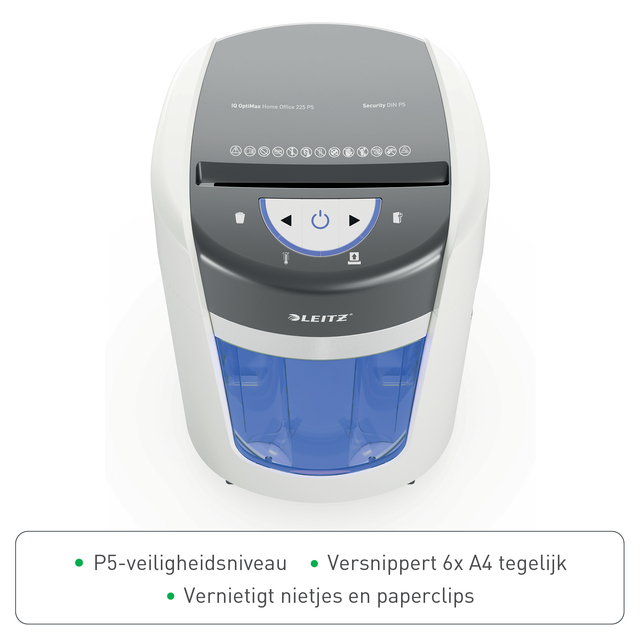 * De Leitz IQ OptiMax papiervernietiger biedt een innovatieve en stijlvolle oplossing voor papiervernietiging en zorgt tegelijkertijd voor uitzonderlijke documentbeveiliging en gemoedsrust. * Deze zeer veilige DIN P5 papiervernietiger versnippert moeiteloos tot 10x A4-vellen per keer tot microsnippers in slechts 10 seconden. * IQ OptiMax heeft een unieke Bin Rotation Technology (BRT), die de capaciteit effectief met +33%* maximaliseert. * De roterende bak zorgt voor een vlakke en gelijkmatige verdeling van het papier, zodat er geen piek in de bak ontstaat en er 140x extra A4-vellen kunnen worden versnipperd voordat de bak moet worden geleegd. * BRT betekent dat je de opvangbak niet hoeft te verwijderen of te schudden; de 'opvangbak vol'-aanduiding wordt alleen geactiveerd als de opvangbak 100% capaciteit heeft bereikt. * De ruime opvangbak van 35 liter is geschikt voor 550 x A4-vellen en wordt blauw verlicht tijdens gebruik voor de ultieme versnipperervaring. * Het intuïtieve LED-display bevat rode waarschuwingsaanduidingen voor verschillende situaties, zoals volle opvangbak en deur open. * Leitz IQ OptiMax is veelzijdig voor elke werkomgeving dankzij de ultrastille werking, het slanke ontwerp en de indrukwekkende duurzaamheid. * Continue werkduur van 120 minuten. * Dynamisch LED-display met waarschuwingsaanduidingen voor volle opvangbak, deur open, oververhitting en overbelasting. * Ultrastille werking - voor een rustige werkomgeving (bij regelmatig gebruik van Leitz olievellen). * Versnippert nietjes en paperclips, je hoeft ze niet eerst te verwijderen. * Continu 2 uur / 120 min werkduur - volledig ononderbroken versnipperen, ideaal voor kantoorgebruik. * Anti-vastlooptechnologie betekent dat de papiervernietiger automatisch stopt en het papier terugdraait als er te veel papier wordt ingevoerd. * De versnipperaar heeft een cirkelvormig ontwerp, waardoor hij gemakkelijk in krappe ruimtes past voor optimale ruimtebenutting. * Gemakkelijk te verplaatsen naar verschillende locaties dankzij vier zwenkwielen van hoge kwaliteit. * 2 + 1 jaar garantie (ook op de messen) - registreer je om het extra garantiejaar te claimen.