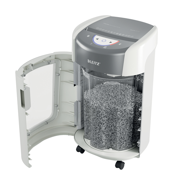 Volautomatische papiervernietiger van Leitz. Zo intelligent dat hij zelfstandig werkt, voer je stapel papier (incl. nietjes & paperclips) in, sluit het deksel en ga verder met waarmee je bezig was. Ideaal voor klein kantoor of kantoor aan huis. Hogere beveiliging en uitstekende prestaties met de anti-vastlooptechnologie, stille en 10 minuten doorlopende werkduur auto feed papiervernietiger. Vernietigt automatisch 50 vellen A4 in P4 cross cut snippers (4x28mm) tegelijkertijd in de ruime 20L opvangbak. Eenvoudige bediening door middel van tiptoetspaneel. * Producteigenschappen; * Automatische invoerfunctie voor maximaal 50 A4-vellen. Versnippert tot 6 vellen (80 gsm) tegelijkertijd bij handmatige invoer. * Infrarood „bak vol” sensor. * Ultrastille werking - voor een rustige werkomgeving (bij regelmatig gebruik van Leitz oliepapier). * Anti-vastlooptechnologie voor ononderbroken papiervernietiging - stopt automatisch en duwt het papier naar buiten als er te veel papier wordt ingevoerd. * Continue doorlooptijd van 10 minuten. * Veiligheidsniveau DIN P4 cross cut (4x28mm). * Compacte uittrekbare bak van 20L zodat alle invoer in één keer kan worden vernietigd. * Tiptoetsbediening - simpel en intuïtief voor eenvoudige bediening