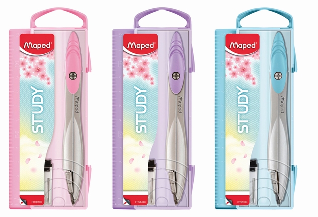 * Study is wereldwijd onze bestverkochte passer. * Nu verkrijgbaar in trendy pastel kleuren. * Ergonomische kop. * Doosje met geïntegreerde liniaal.