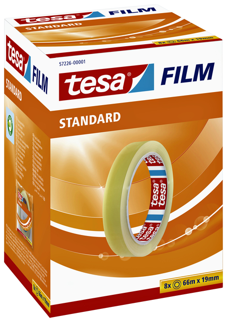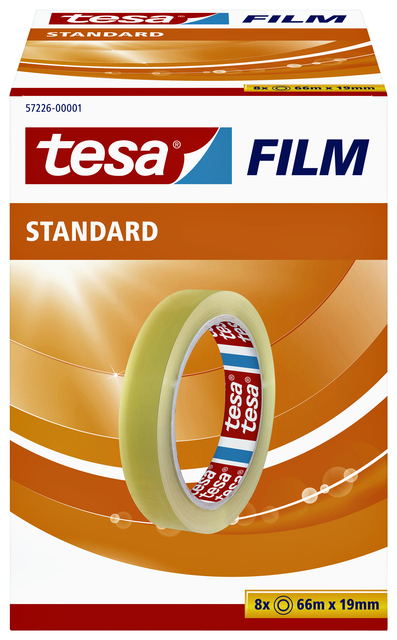 * tesafilm® Standard is een transparant plakband voor allerlei toepassingen thuis, op school en op kantoor. * Het hecht goed is zeer bestand tegen veroudering tesafilm® Standard is het meest gebruikte plakband dat thuis, op school en op kantoor te vinden is. * Het is een multifunctionele transparante tape voor allerlei toepassingen. * De transparante tape is vrij van pvc en oplosmiddelen, het hecht goed en is zeer bestand tegen uv-licht en veroudering. * De tape rolt stil af en kan gewoon met de hand worden afgescheurd. * Je kunt ook een van de tesafilm® hand-of bureautapedispensers gebruiken. * Lengte 66mx19mm. Besteladvies doos à 8 stuks.
