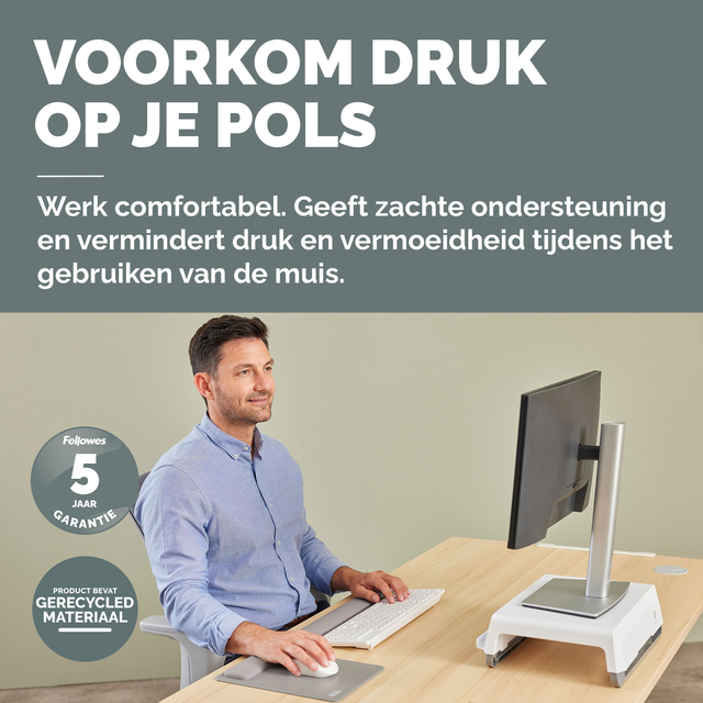 De HEX Cushion Technology™, waarvoor patent is aangevraagd, zorgt voor gelijkmatige ondersteuning en comfort tijdens het typen. De zachte, stofwerende polssteun heeft een mooie afwerking en zorgt voor een soepele typervaring. De ingebouwde Microban®-bescherming helpt bacteriën tegen te gaan en werkt 24/7 voor extra bescherming van het product. * 100% recyclebaar via het terugnameprogramma van Fellowes. Gemaakt om lang mee te gaan, met 5 jaar beperkte garantie. Getest door FIRA International Ltd om te voldoen aan de ergonomische eisen van de Europese gezondheids- en veiligheidswetgeving: EN ISO 9241-5.