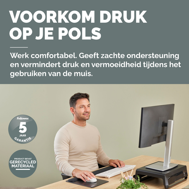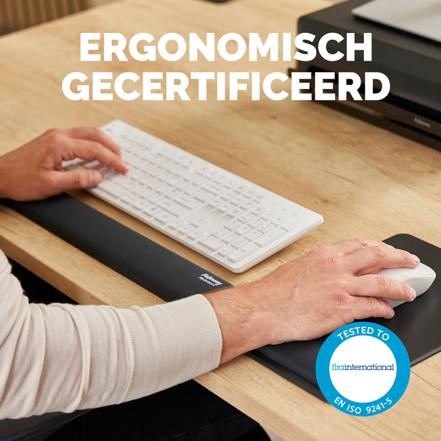 De HEX Cushion Technology™, waarvoor patent is aangevraagd, zorgt voor gelijkmatige ondersteuning en comfort tijdens het typen. De zachte, stofwerende polssteun heeft een mooie afwerking en zorgt voor een soepele typervaring. De ingebouwde Microban®-bescherming helpt bacteriën tegen te gaan en werkt 24/7 voor extra bescherming van het product. 100% recyclebaar via het terugnameprogramma van Fellowes. Gemaakt om lang mee te gaan, met 5 jaar beperkte garantie. Getest door FIRA International Ltd om te voldoen aan de ergonomische eisen van de Europese gezondheids- en veiligheidswetgeving: EN ISO 9241-5.