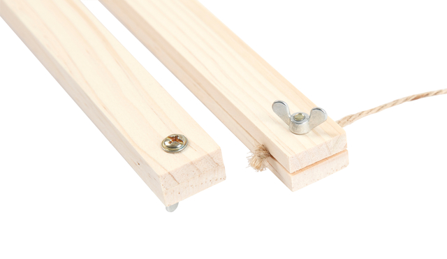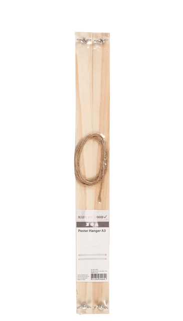 * Set van posterlijsten van licht hout. * De set bestaat uit 2 boven- en 2 onderlijsten, waarbij de ophanging wordt gefixeerd door middel van een vleugelmoer. * Geleverd met apart ophangkoord, dat met een knoop aan de onderzijde van de bovenste strips is bevestigd. * Afmeting: diepte 2,2cm, breedte 33,6cm, hoogte 2cm.