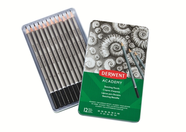 * Schetsen is veelal de basis van alle ontwerpen. * Zachte potloden (B - 6B) zijn het best geschikt voor het schetsen en het mengen, harde potloden (HB - 5H) zijn ideaal voor rechte lijnen en gedetailleerd werken. * Derwent Academy schetspotloden biedt u een overzichtelijke range van 12 soorten schetspotloden, van een zachte 6B variant tot een harde 5H, waarmee je alle stijlen van tekenen kunt tackelen. * Inhoud blik: 6B, 5B, 4B, 3B, 2B, B, HB, H, 2H, 3H, 4H en 5H.