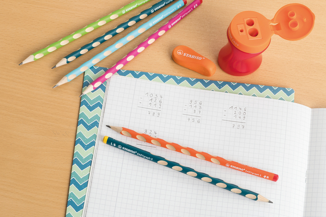 Het potlood scoort niet alleen met zijn ergonomische driekantige vorm, maar overtuigt ook met zijn smalle dikte en anti-slip gripuitsparingen voor links- en rechtshandigen. Dit ondersteunt kinderhanden bij het oefenen met schrijven en helpt bij de ontwikkeling van een leesbaar handschrift. Dun ergonomisch grafietpotlood STABILO EASYgraph S in Classpack met 48 potloden. Inhoud: 2 verschillende modellen linkshandig en rechtshandig.