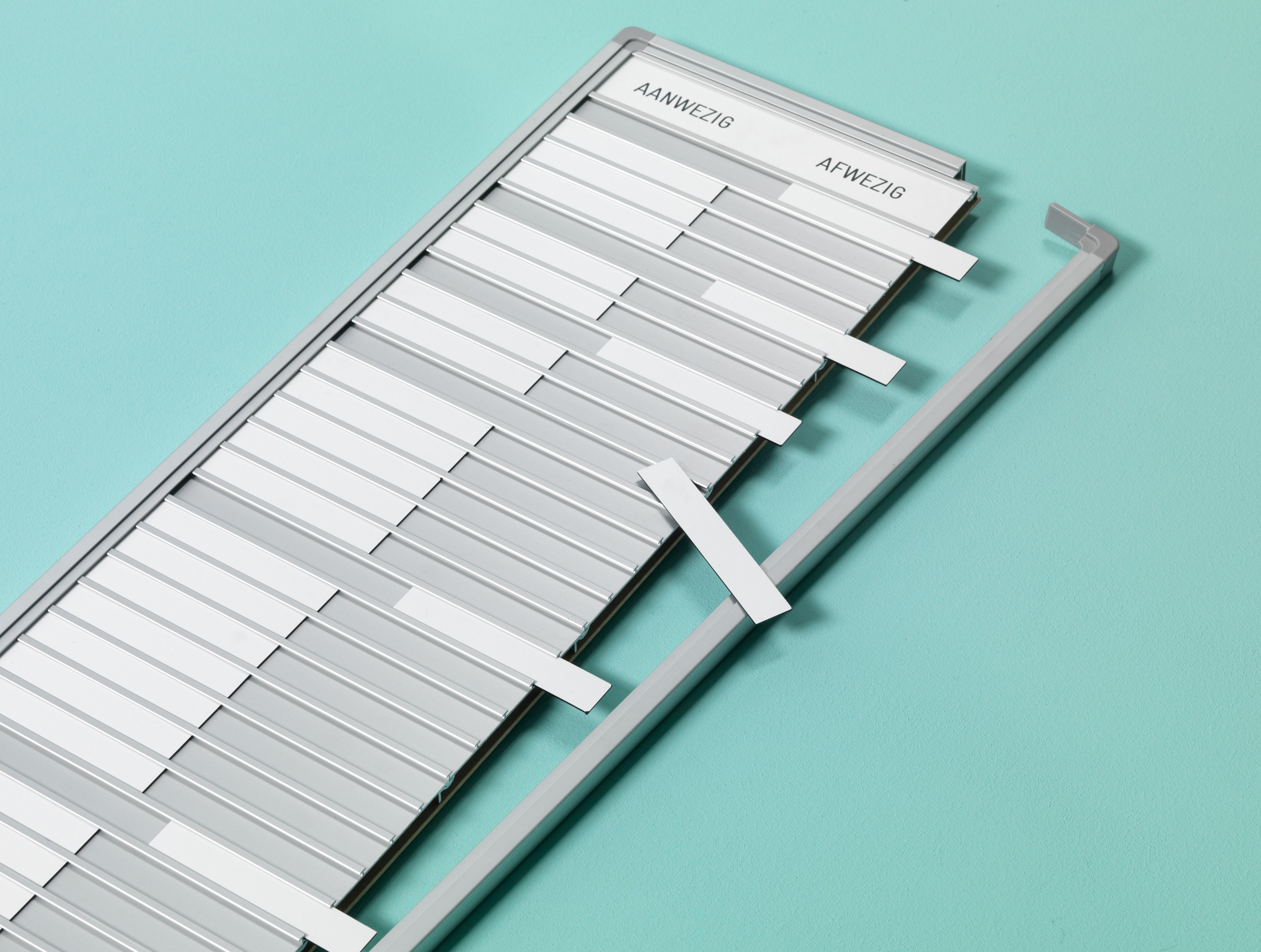 Presentiebord met graveerbare plaatjes in 10, 20 en 30 posities. Rechterkant profiel is uitschuifbaar waardoor de plaatjes gemakkelijk vervangen kunnen worden. Voorzien van aluminium geanodiseerd softline profiel.Geleverd inclusief ophangmateriaal en blanco graveerplaatjes.