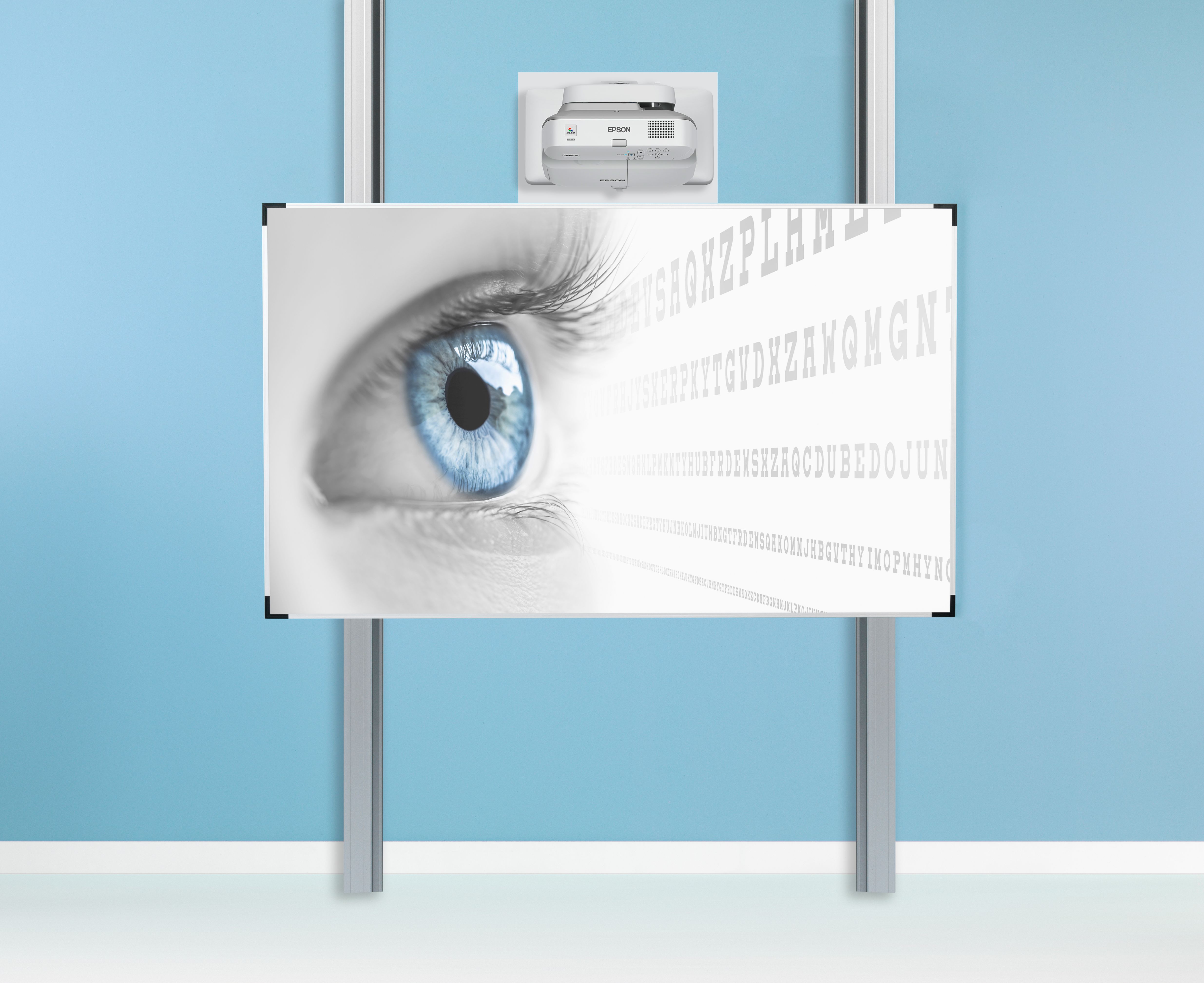 Projectiebord voor interactieve projectoren (16:9), zoals bijv. Epson EB-1480Fi. Zeer dunne en lichte constructie met vlak opliggend aluminium profiel. Oppervlak: Low Gloss emailstaal. Inclusief 2 aluminium afleggoten van 31 cm. Kolomborden traploos in hoogte verstelbaar, zeer stabiele constructie. Magneethoudend en droog uitwisbaar.