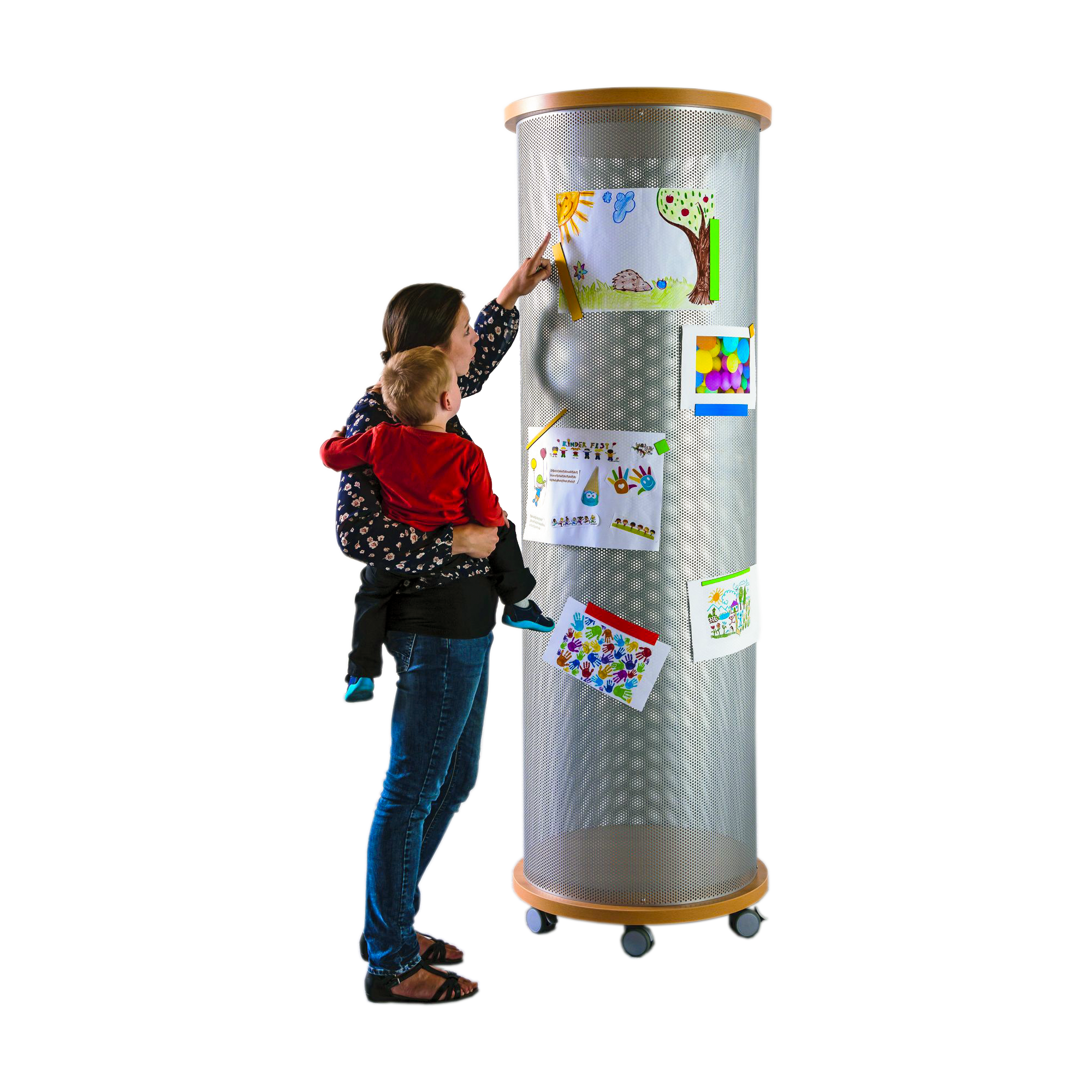 Ronde reclamezuil met geperforeerde metalen wanden. Voor het geperforeerde plaatwerk van onze informatiezuilen zijn diverse RAL-kleuren leverbaar. De ronde boven- en onderplaten van de geperforeerde plaatstalen zuil hebben een diameter van 70 cm en zijn 3,8 cm dik. Dankzij 5 zwenkwielen, waarvan 2 met rem, is de zuil eenvoudig te verplaatsen.