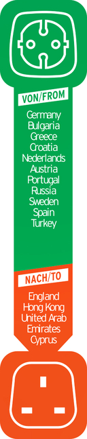 * 1-delige veiligheidsstekker voor het aansluiten van elektrische apparaten met Duits geaarde stekkersysteem voor stopcontacten in Engeland. * Geschikt voor stopcontacten in de landen: Engeland, Hong Kong, Verenigde Arabische Emirate, Cyprië. * Met hogere contactbescherming: kunststof plaatjes sluiten de contacten van het stopcontact af. * De adapter is ideaal voor het opladen van uw apparaten op reis of op vakantie * Inhoud: 1 x reisadapter voor het stopcontact in de kleur zwart – in de beste kwaliteit van Brennenstuhl® * Met 13 A zekering. * De stekkeradapter is geen spannings- en frequentieomzetter.