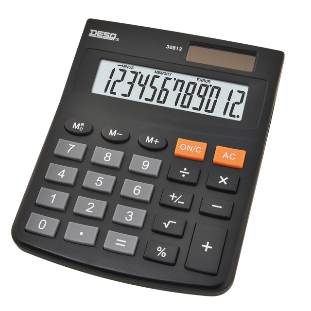 * Standaard bureaurekenmachine uitgerust met alle basisfuncties en 12-cijferig display. * Werkt op zonne-energie en batterij. * Energiebesparende auto-off modus. * Schuin gepositioneerd duidelijk leesbaar LCD scherm. * 3-toetsen geheugen. * Rubberen voetjes. * Lay-out met voor de hand liggende kleur segmenten (functies/cijfers/on-ac) voor gemakkelijke input. * Afmetingen 131x104x21mm.