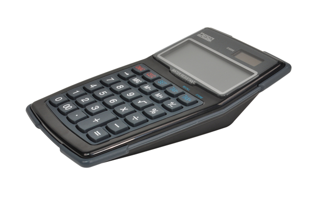 * De rekenmachine die tegen een stootje kan. * Speciaal aanbevolen voor gebruik in magazijnen en in de ambulante handel. * Werkt op zonne-energie en batterij. * Water-, stof- en schokbestendig. * Rubberen toetsenbord. * Groot en schuin gepositioneerd duidelijk leesbaar LCD scherm. * LCD scherm voorzien van acryl glas. * Function Command Signs: huidige functieteken is weergegeven boven de cijfers. * Zakelijke functies: BTW - Backspace - 00. * 3-toetsen geheugen. * 3,8x10,3x15,6cm (HxBxD). * LR44 batterij meegeleverd.