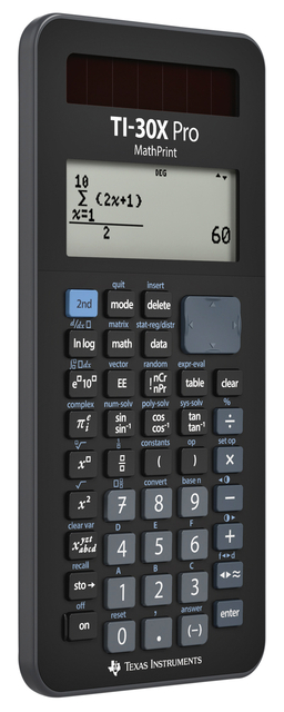* TI-30XS heeft tot vier regels MultiView Display. * Elementaire wetenschappelijke en goniometrische functies én hyperboolfuncties. * Multi-line scherm maakt patroonherkenning en het overlopen van uitgevoerde berekeningen eenvoudiger. * Twee variabelen statistiek: Enter/delete/insert/edit individuele statistische data. * Equation Recall maakt het mogelijk uitgevoerde berekeningen of data weer op te roepen, te bekijken, te bewerken of te verbeteren. * Maakt het mogelijk bewerkingen met breuken in breukvorm of in decimale notatie in beeld te brengen. * Data editor voor de invoer van lijsten met data. * List function maakt het mogelijk functies op datalijsten toe te passen. * Wortels in beeld, werk met vereenvoudigde wortels en rationaliseer de noemer. * Conversies via het Mode Menu: om op verschillende manieren te rekenen met hoekeenheden, notaties en floating point. * Rekent met door de gebruiker gedefinieerde variabelen. * Dubbele voeding: zonne-energie en verwisselbare batterij (CR2032).